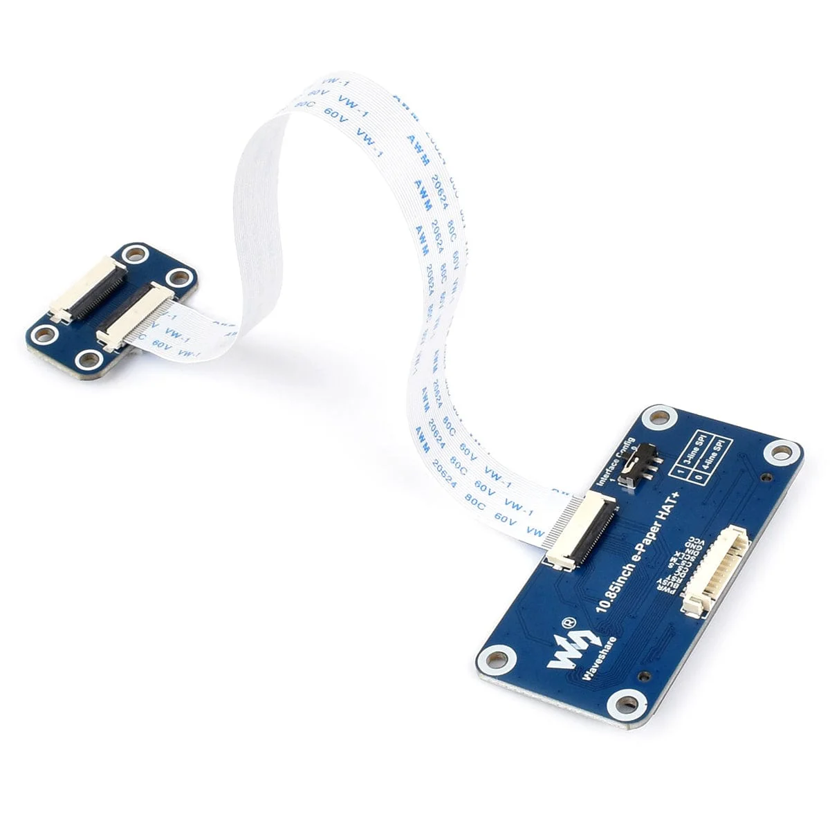 This variant includes the Waveshare e-Paper Driver HAT, which provides a Raspberry Pi-compatible SPI interface, HAT+ standard GPIO header, and onboard voltage translation for use with both 3.3V and 5V MCUs. Note that the full refresh time is approximately 21 seconds, and partial refresh is not supported.