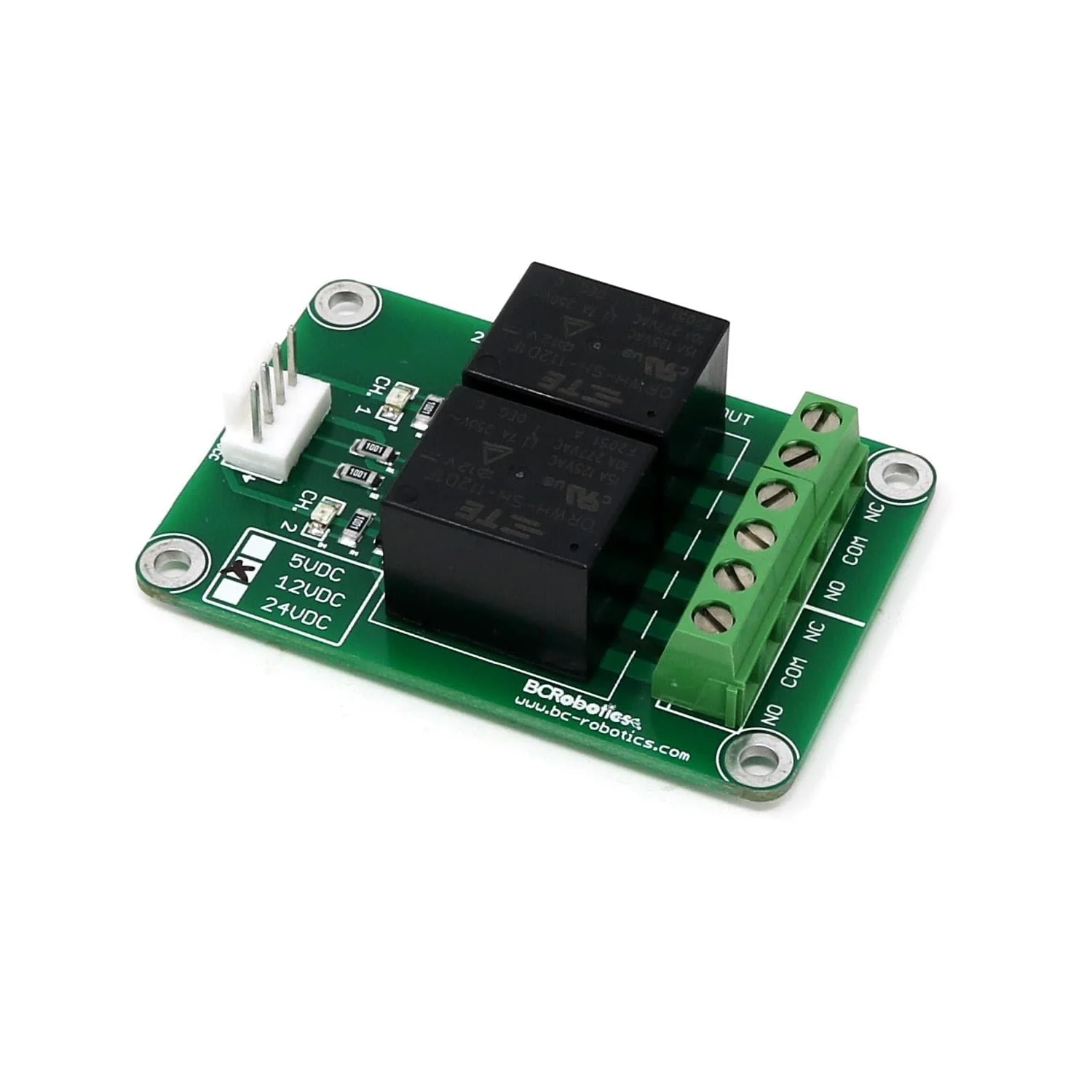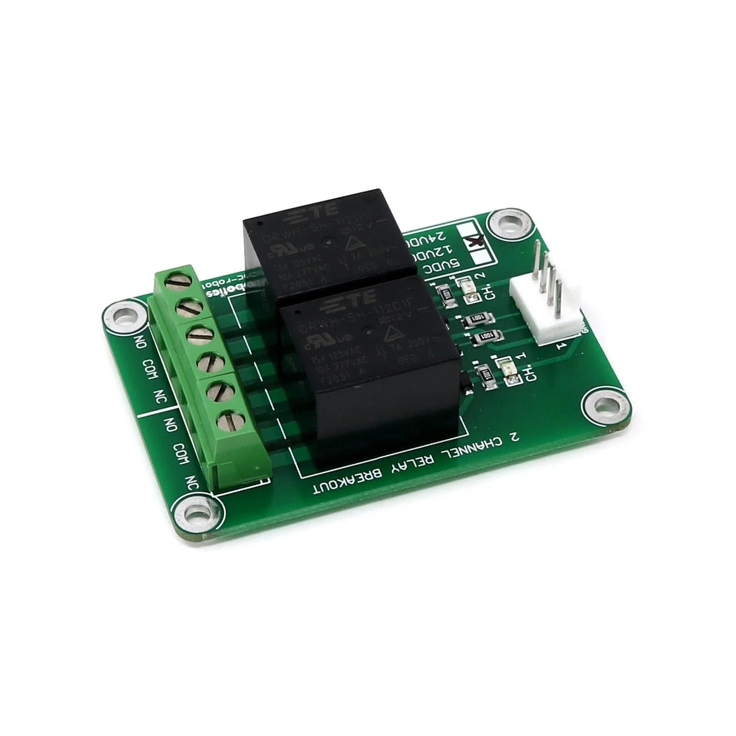 The board uses high-quality North American sourced parts. Simply connect 12V power, Ground, and your digital inputs to the 4 pin header and that’s it – no need for any additional components! We offer a matching 4-pin Molex KK to male jumper cable for this relay module here!