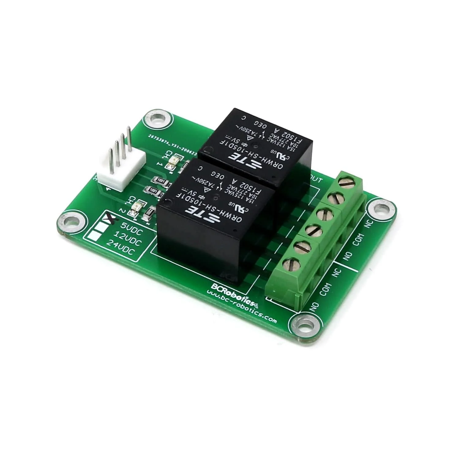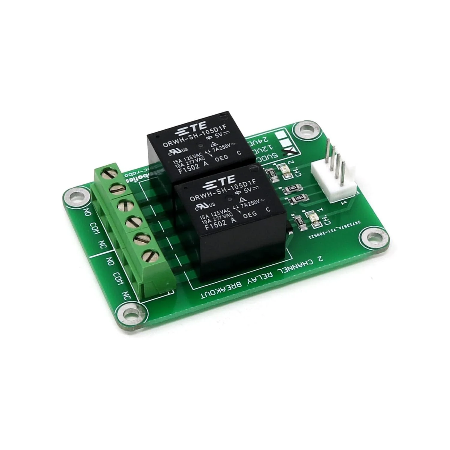 The board uses high-quality North American sourced parts and logic that is a lot more friendly to common microcontrollers and single-board computers. Simply connect 5V power, Ground, and your digital I/O to the 4 pin header and that’s it – no need for any additional components! We offer a matching 4-pin Molex KK to male jumper cable for this relay module here!