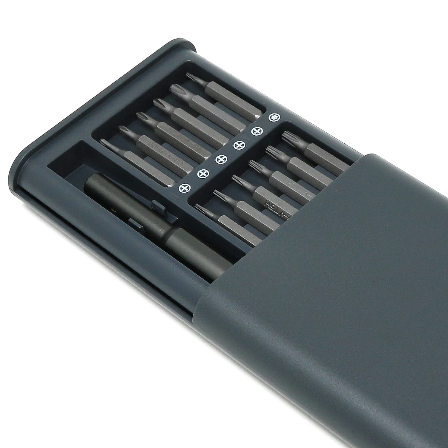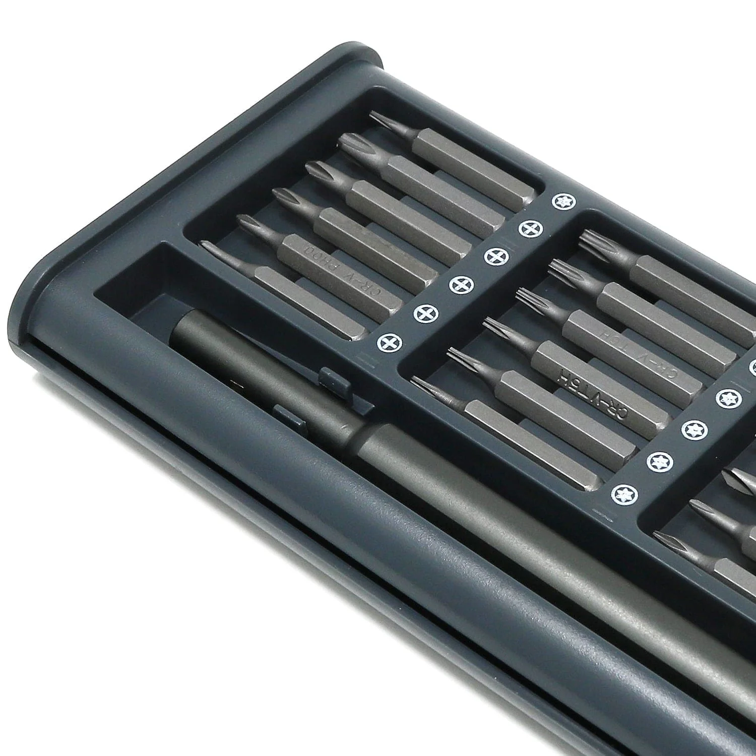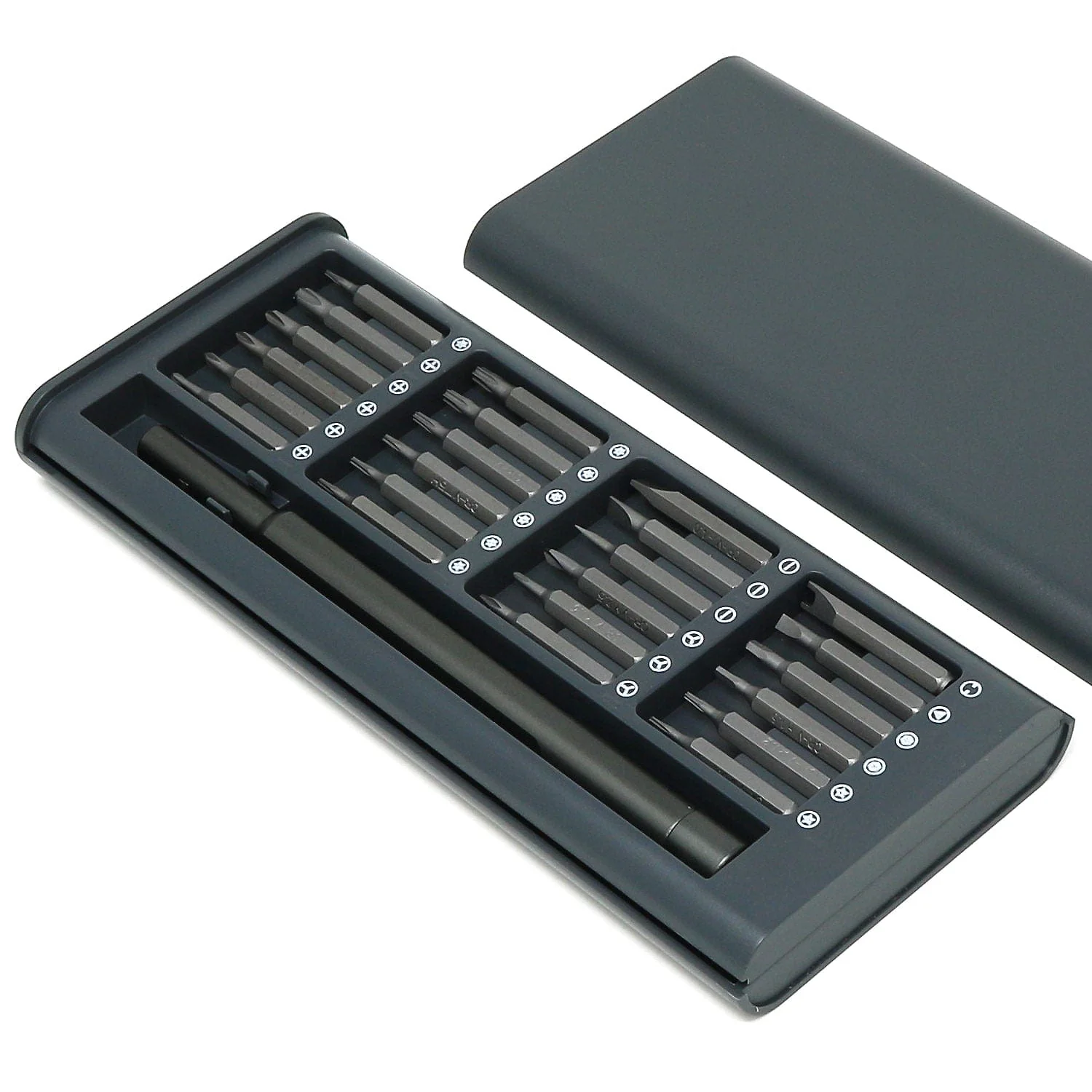 This particular model is the 25-in-1 precision screwdriver set with a sliding plastic cover, magnetic organised bit storage and a slim precision driver with a magnetic tip holder and spinning base.