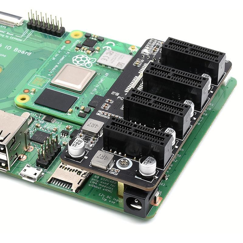 This adapter board from Waveshare allows you to extend the single PCIe socket on your Raspberry Pi Compute Module 4 IO board (or alternative compatible IO board) to four sockets, allowing additional devices to be used in your project.