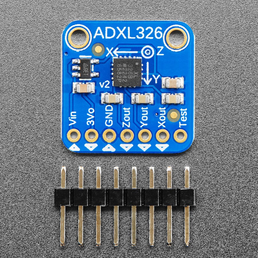 The ADXL326 is the latest and greatest from Analog Devices, known for its exceptional quality MEMS devices. The VCC takes up to 5V in and regulates it to 3.3V with an output pin. The analogue outputs are ratiometric: that means that 0g measurement output is always at half of the 3.3V output (1.65V), -16g is at 0v and 16g is at 3.3V with full scaling in between.