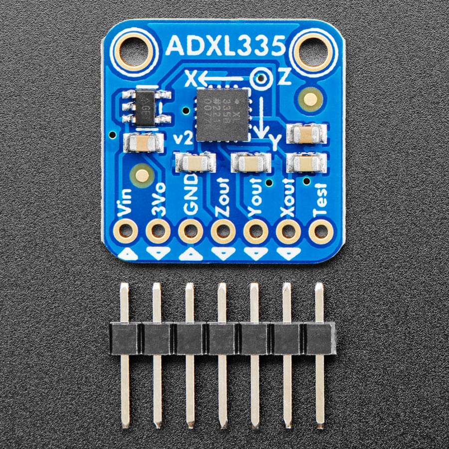 We've updated our favourite triple-axis accelerometer to now have an onboard 3.3V regulator - making it a perfect choice for interfacing with a 5V microcontroller such as the Arduino. This breakout comes with 3 analogue outputs for X, Y and Z axis measurements on a 0.75"x0.75" breakout board. The ADXL335 is the latest and greatest from analogue devices, known for its exceptional quality MEMS devices. The VCC takes up to 5V in and regulates it to 3.3V with an output pin. The analogue outputs are ratiometric: that means that 0g measurement output is always at half of the 3.3V output (1.65V), -3g is at 0v and 3g is at 3.3V with full scaling in between.