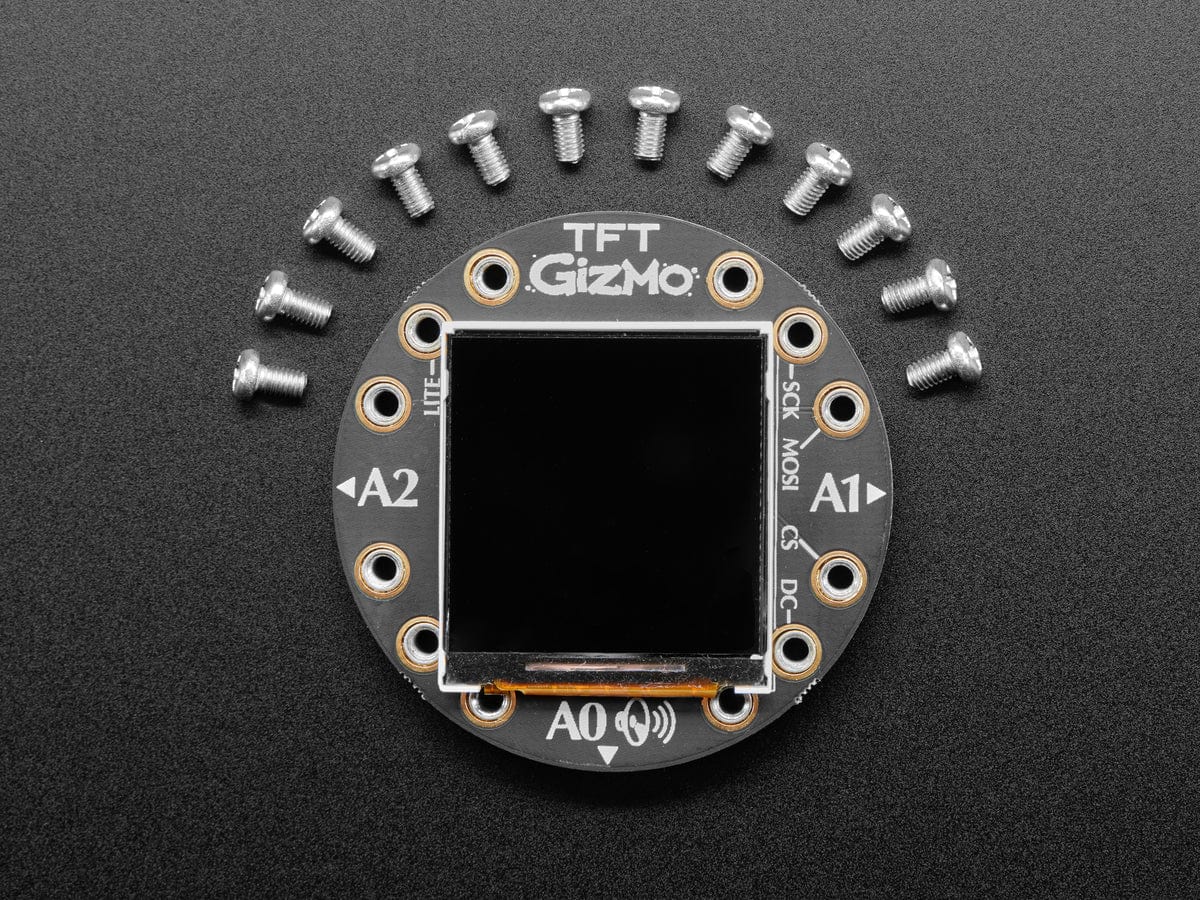 Extend and expand your Circuit Playground projects with a bolt on TFT Gizmo that lets you add a lovely color display in a sturdy and reliable fashion. This PCB looks just like a round TFT breakout but has permanently affixed M3 standoffs that act as mechanical and electrical connections.