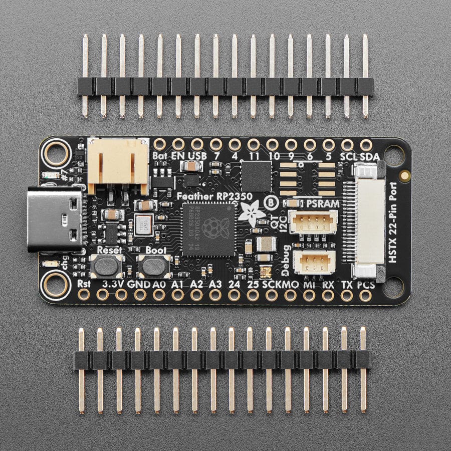 RP2350 flies high with the Feather format - now you can use any FeatherWings with this battery-powered dev board. It comes with 8MB of flash, a 22-pin HSTX output port, Stemma QT, debug SWD, and an optional PSRAM spot. It's our first RP2350 board and we crammed a ton of goodies into our classic Feather format. It's an excellent starter board to go along with your Pico 2.