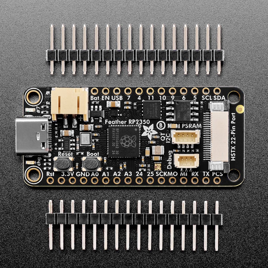 RP2350 flies high with the Feather format - now you can use any FeatherWings with this battery-powered dev board. It comes with 8MB of flash, a 22-pin HSTX output port, Stemma QT, debug SWD, and an optional PSRAM spot. It's our first RP2350 board and we crammed a ton of goodies into our classic Feather format. It's an excellent starter board to go along with your Pico 2.