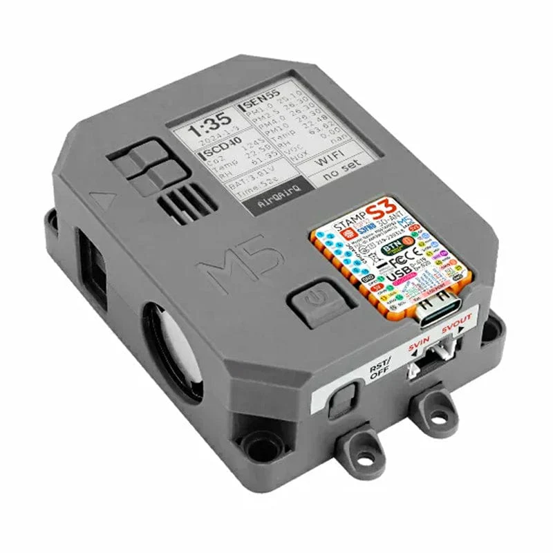 The Air Quality Kit with M5StampS3 is a low-power air quality monitoring device that provides detailed air quality insights. It has several components, including the SEN55 air quality sensor and the SCD40 CO2 sensor, which measure PM1.0, PM2.5, PM4, PM10 particles, temperature, humidity, VOC, and CO2 levels. It works with the StampS3 main controller and features 8M Flash memory for data processing and storage.