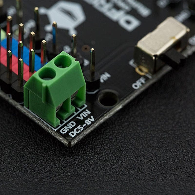It also includes a convenient external power supply and a 5-8v switch to power the board on and off. To use the shield, the Bluno Beetle is stacked onto the shield's I/O pins and then soldered in place.