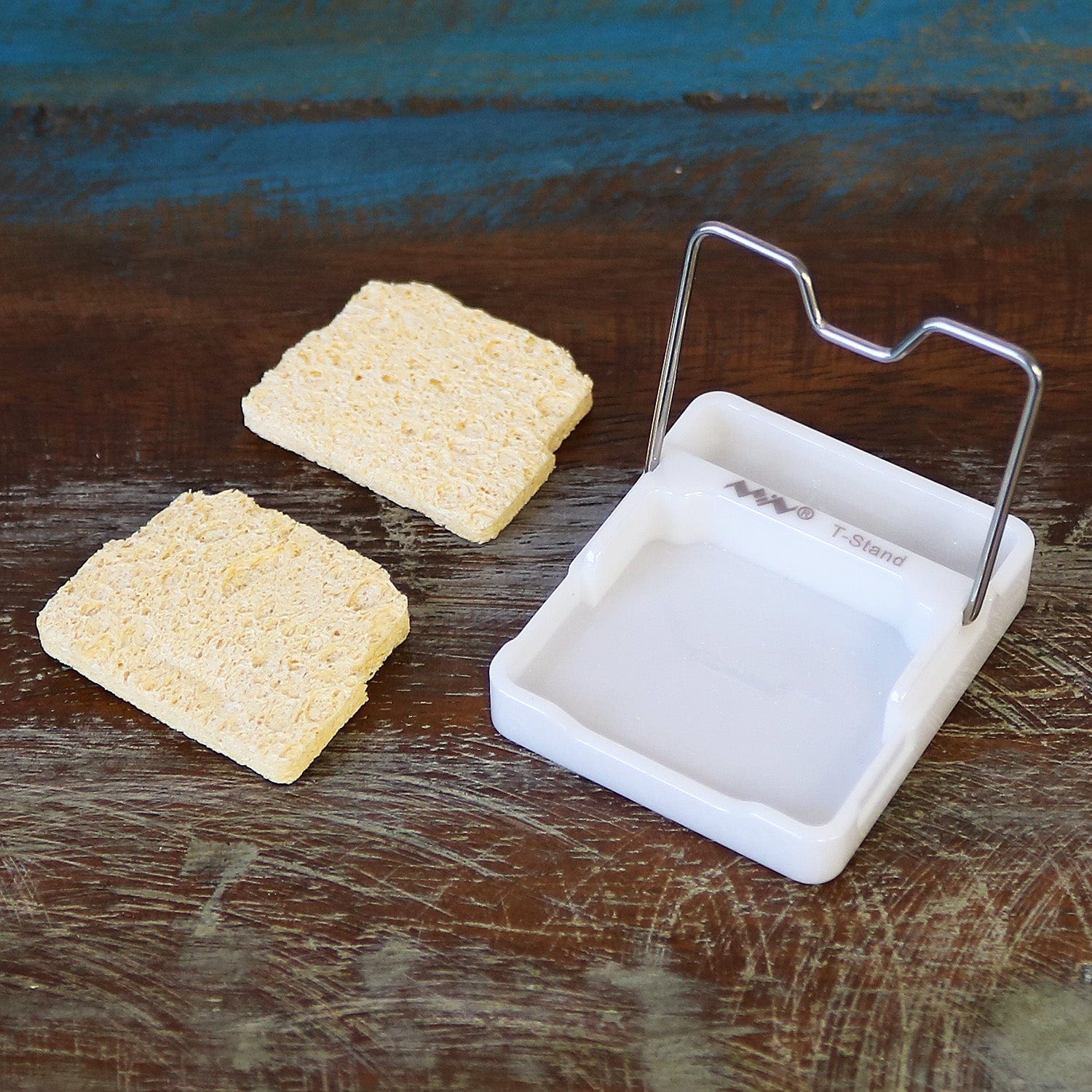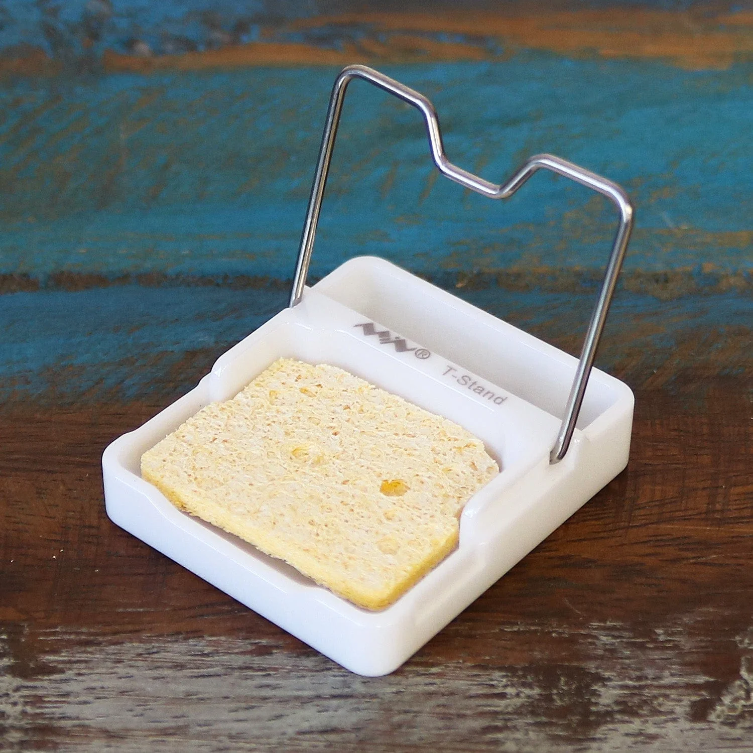 Compact yet sturdy, this zirconia stand includes a small sponge section for cleaning your tip, complete with two sponges. The metal bar folds down when not in use, and comes complete in a small plastic storage box for travelling. The base has a non-slip cork layer and there's even a little pocket at the back for solder blobs.