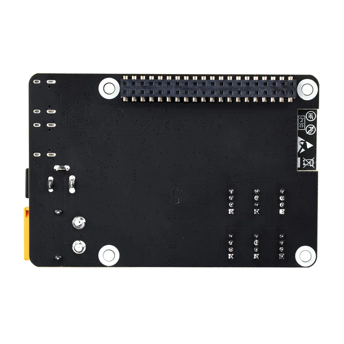 It connects to a Raspberry Pi through its integrated 5V buck regulator circuit and a GPIO 40-pin header connector.