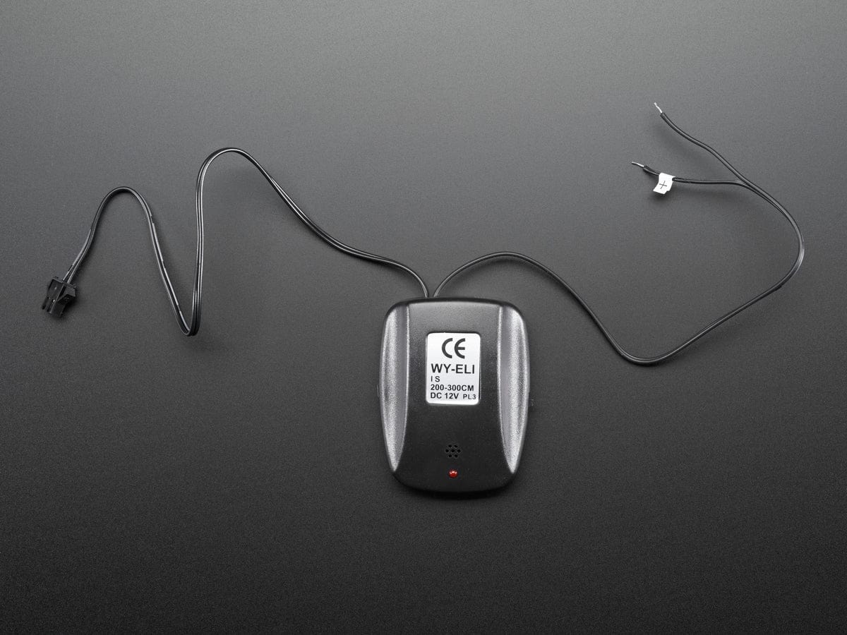 There is a switch for selecting steady/sound/off modes - steady is 'always on'. Comes with a single 2.5mm pitch female JST connectors, standard for all the EL wire and tape we carry. There's also two power wires, you'll need to connect these to a 12VDC power source. The white striped wire goes to +12V, the plain black wire goes to ground.