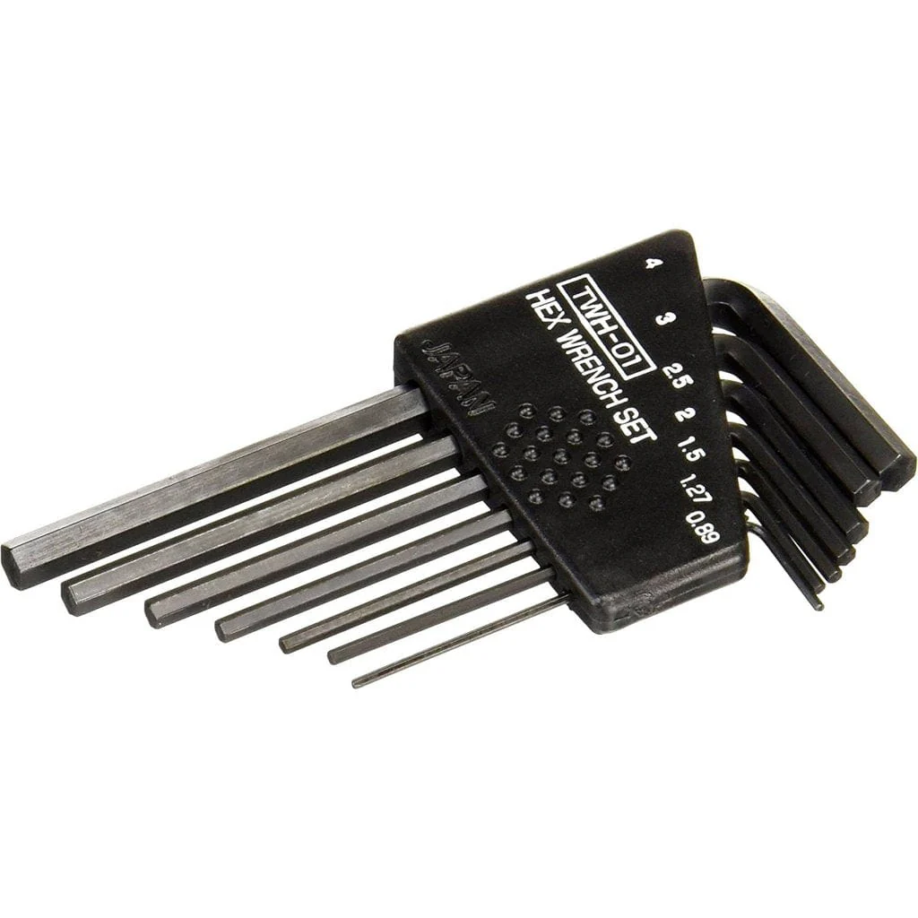 - 7pc metric hex key wrench set containing sizes 0.89mm, 1.27mm, 1.5mm, 2.0mm, 2.5mm, 3.0mm & 4.0mm