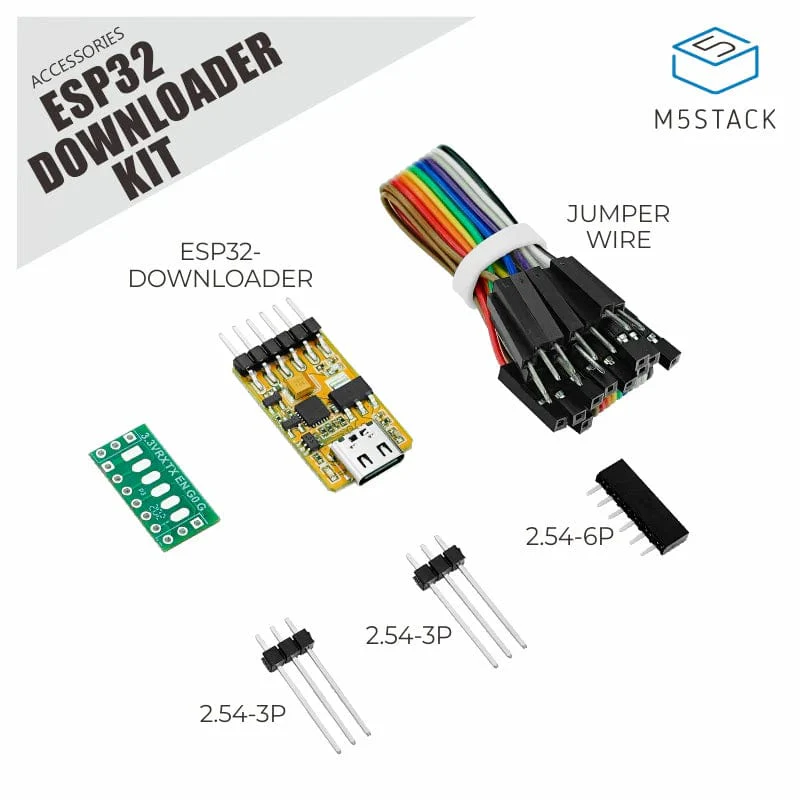This ESP32 downloader kit is a USB-TTL adapter board designed for ESP32 and ESP8266 devices. The kit includes a CP2104/CH9102 chip, allowing for one-touch downloads without manual resetting via chip and pin. The plug-in board and pin headers are very useful for programming or serial debugging ESP32/ESP8266 development boards or M5Stack series products.