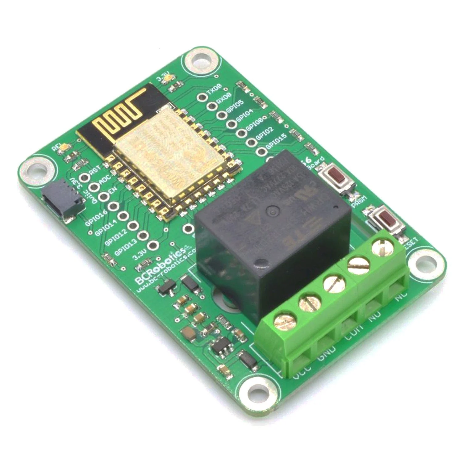 The ESP8266 microcontroller is an excellent choice for IoT projects – it is low-cost, small, and well-supported. However, like most other microcontrollers, it cannot directly control high current or high voltage loads and is not directly compatible with breadboards or perfboards. This assembly allows the ESP8266 to operate within a 12V system, and switch higher voltage / higher current devices from a compact, easy-to-mount, package.