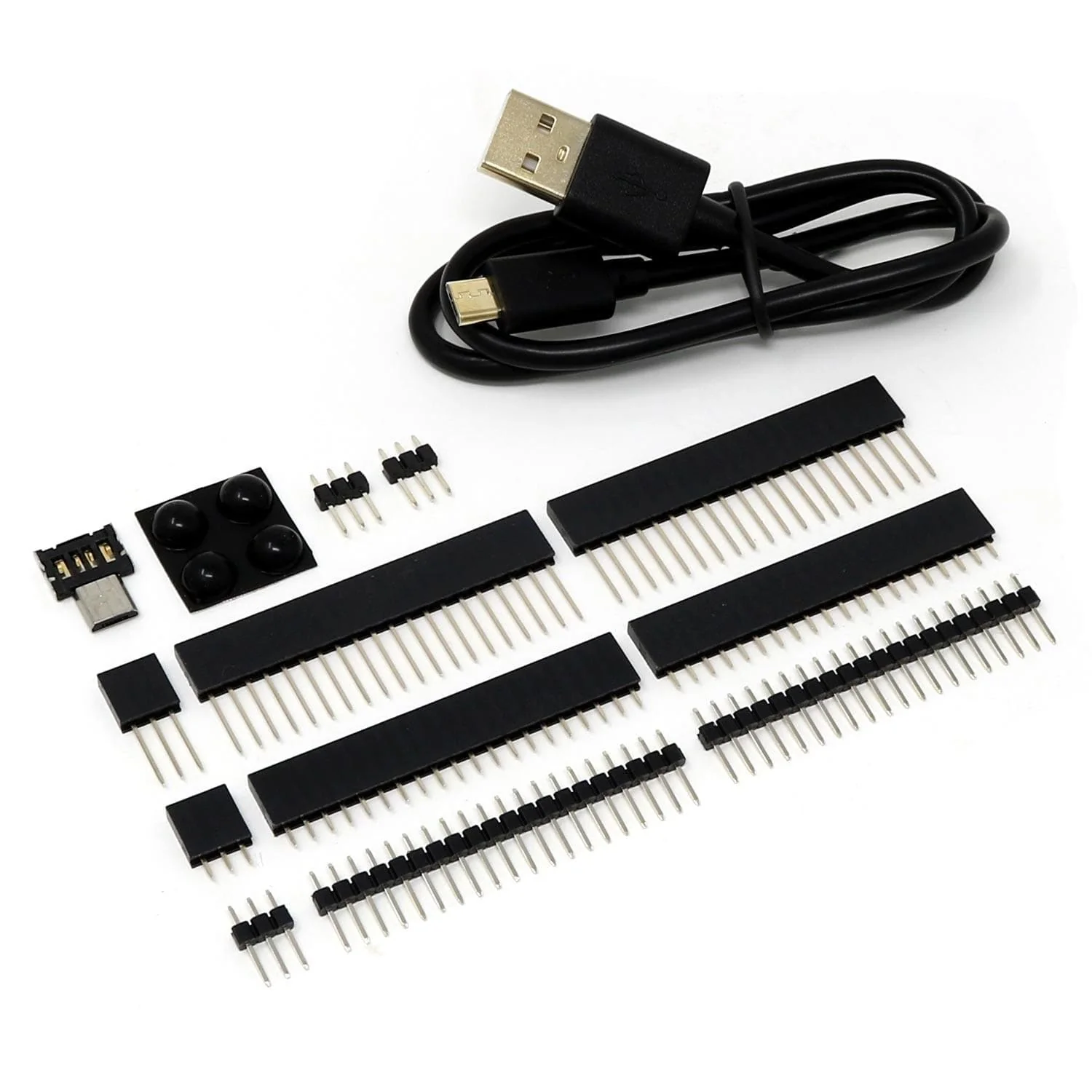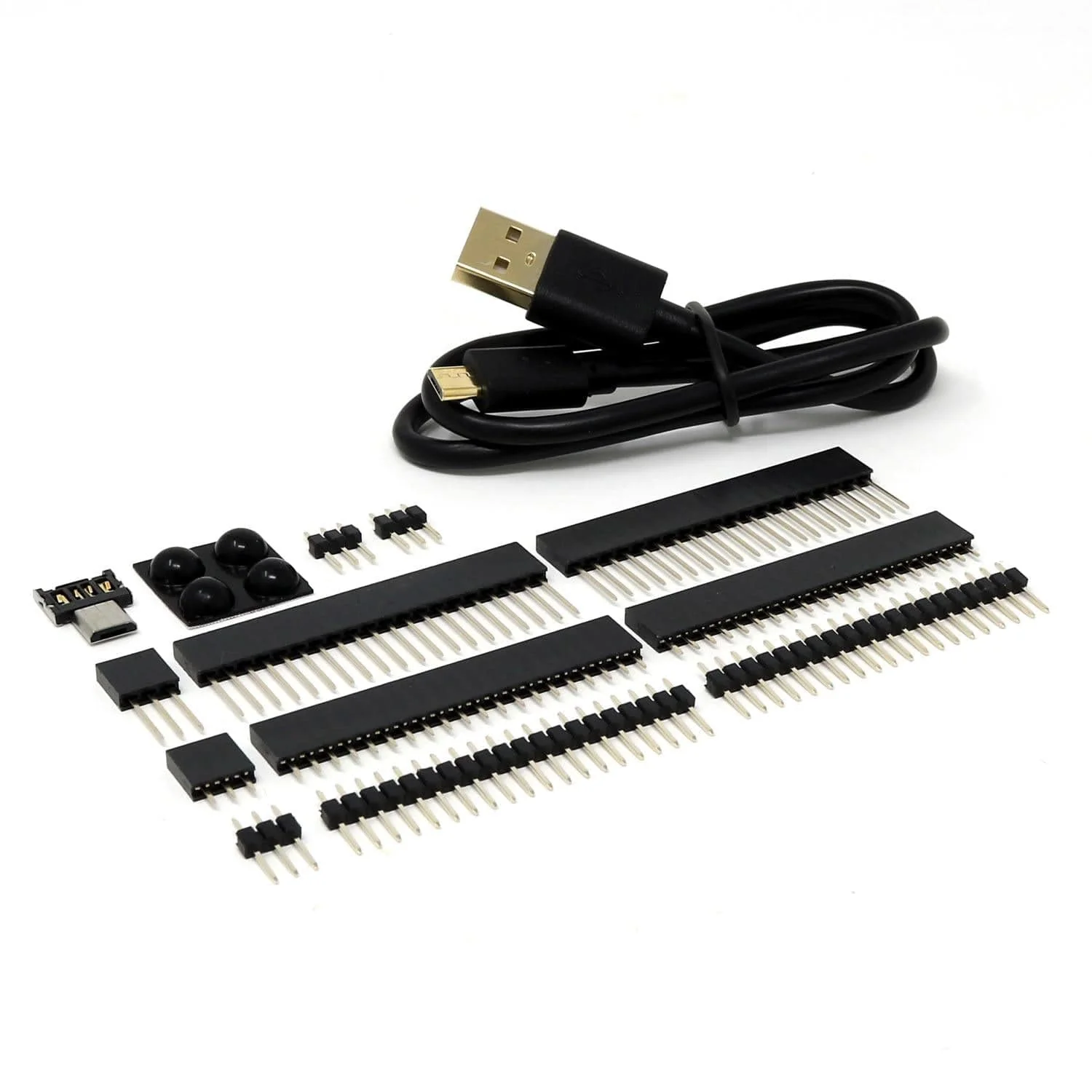 The kit contains a ~50cm micro USB cable for connecting your Pico to a computer for programming, a selection of male, female and stacking headers (including matching debug pin headers), a micro-USB shim for plugging your Pico directly into a USB port and 4 rubber feet for sticking to the bottom of the board.