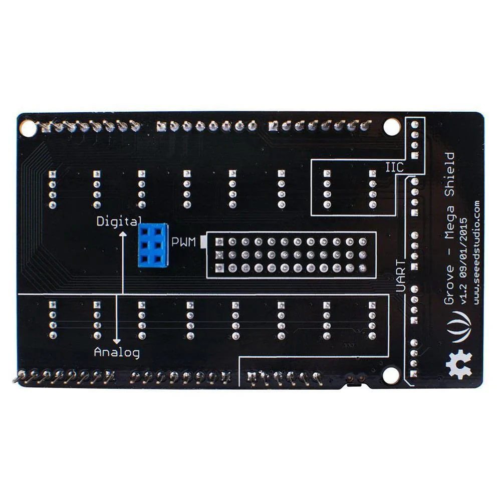 The 4-pin buckled connectors also make wiring more stable. The Mega Shield includes Digital 0-21 and Analogue 0-15. Seeed abandons the Digital 22-53 pins for easily installing the Mega Shield with the Xduino Mega/Google ADK.