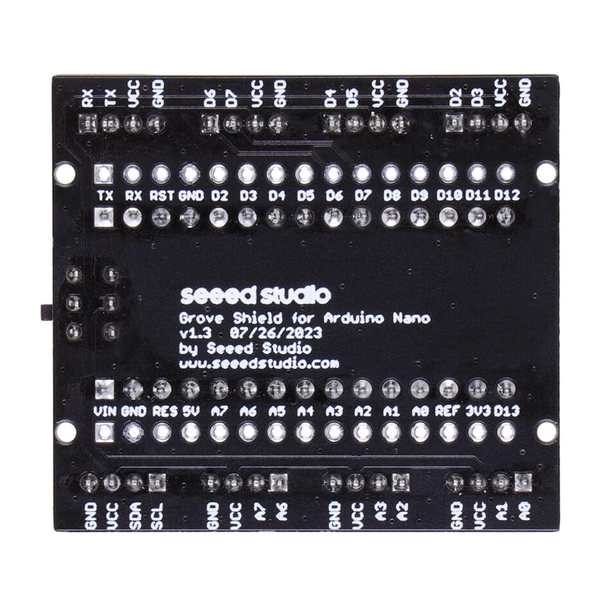 This Grove Shield for the Arduino Nano offers a simple way to connect your Arduino Nano or Seeeduino Nano without the need for breadboards and jumper wires.