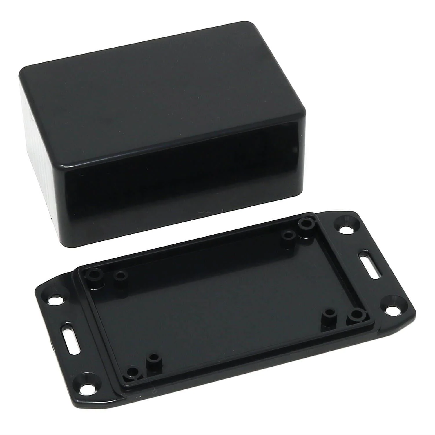 The Hammond range of ABS handheld enclosures are a firm favourite amongst makers as they're an easy starting point for a small, custom enclosure. This model is a Hammond 1551LFLBK 85mm x 56mm x 39mm flanged enclosure.