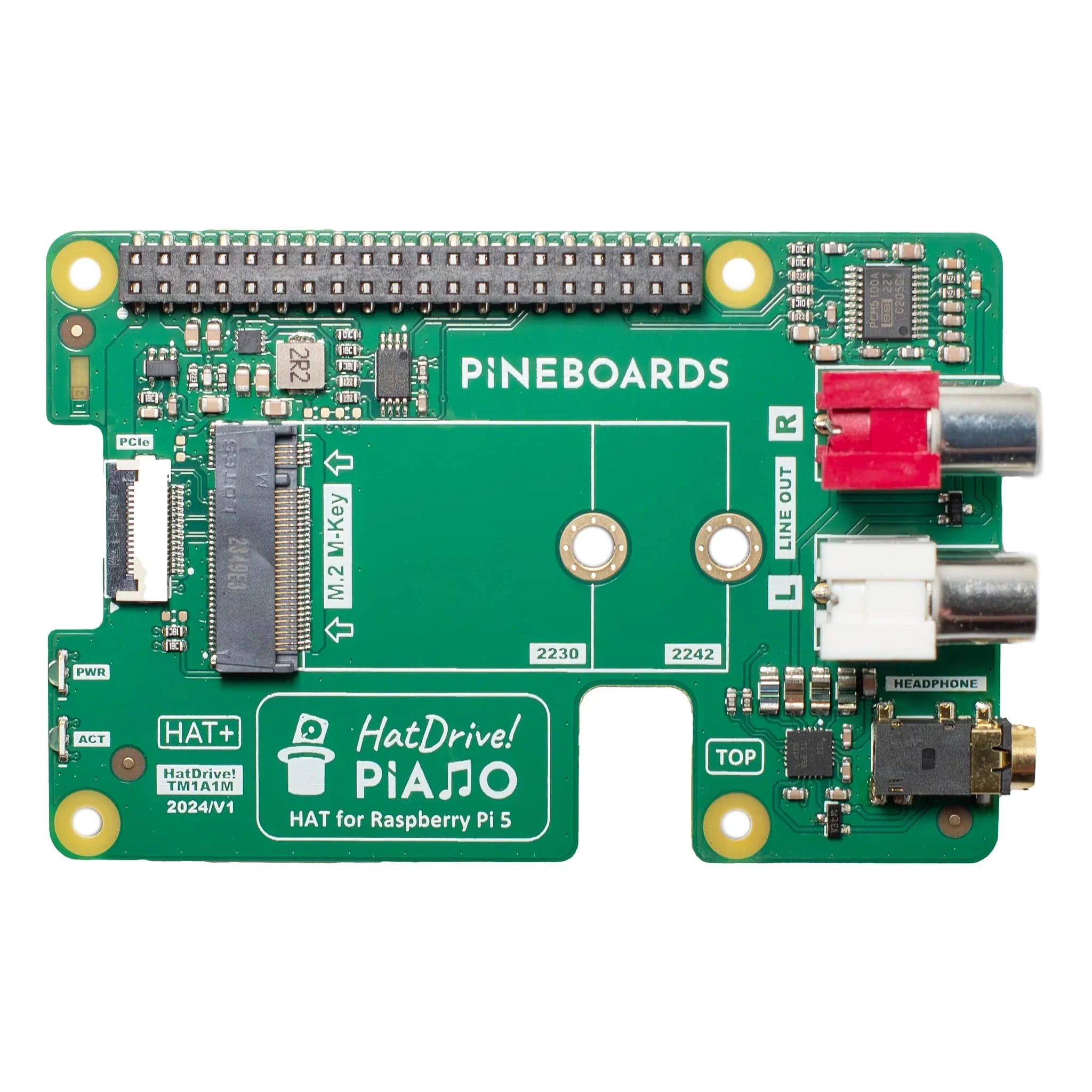 Introducing the HatDrive! Piano from Pineboards - this board adds a Texas Instruments DAC with RCA output and coupled headphone amplifier, along with support for NVMe SSD storage, for your Raspberry Pi 5!