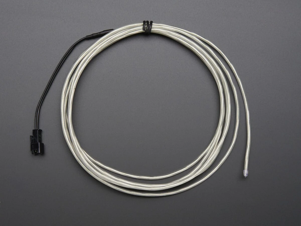 EL Wire, also known as Electroluminescent wire is a stiff wire core coated with phosphor and then covered with a protective PVC sheath. When an AC signal is applied to it, it glows an aqua (blue green) color. It looks a little like thin neon. Very bendable, it keeps its shape and you can curl it around your finger. Its an easy way to add some glow to a project, not as bright as LEDs but uses a lot less power!