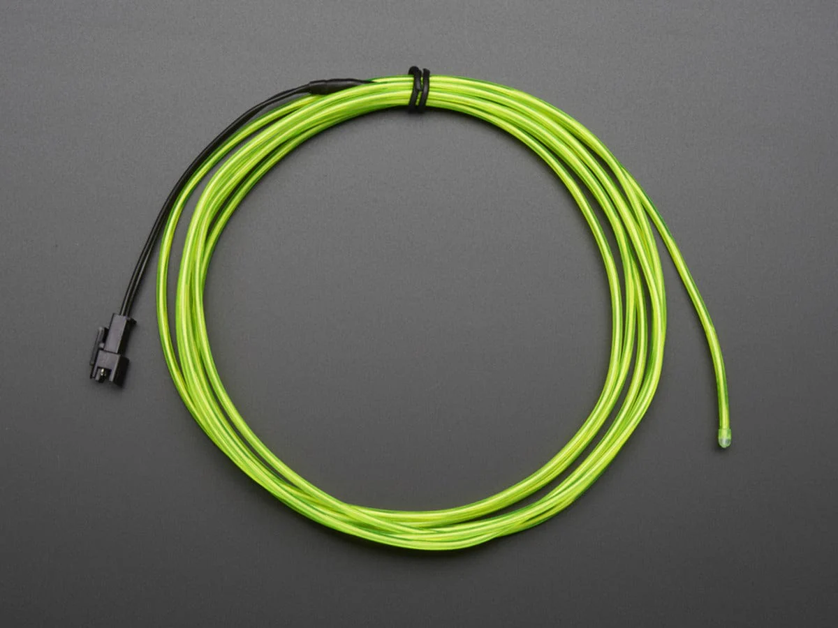 EL Wire, also known as Electroluminescent wire is a stiff wire core coated with phosphor and then covered with a protective PVC sheath. When an AC signal is applied to it, it glows an aqua (blue green) color. You can make it look different colors by changing the coating, for example this is a vivid lime green. It looks a little like thin neon. Very bendable, it keeps its shape and you can curl it around your finger. Its an easy way to add some glow to a project, not as bright as LEDs but uses a lot less power!