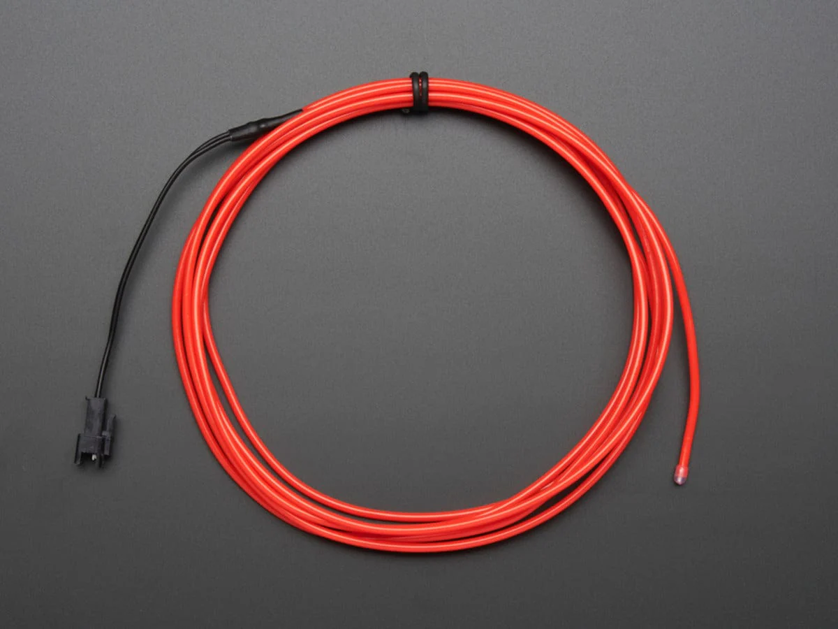 EL Wire, also known as Electroluminescent wire is a stiff wire core coated with phosphor and then covered with a protective PVC sheath. When an AC signal is applied to it, it glows an aqua (blue green) color. You can make it look different colors by changing the coating, for example this is a vivid pink. It looks a little like thin neon. Very bendable, it keeps its shape and you can curl it around your finger. Its an easy way to add some glow to a project, not as bright as LEDs but uses a lot less power!