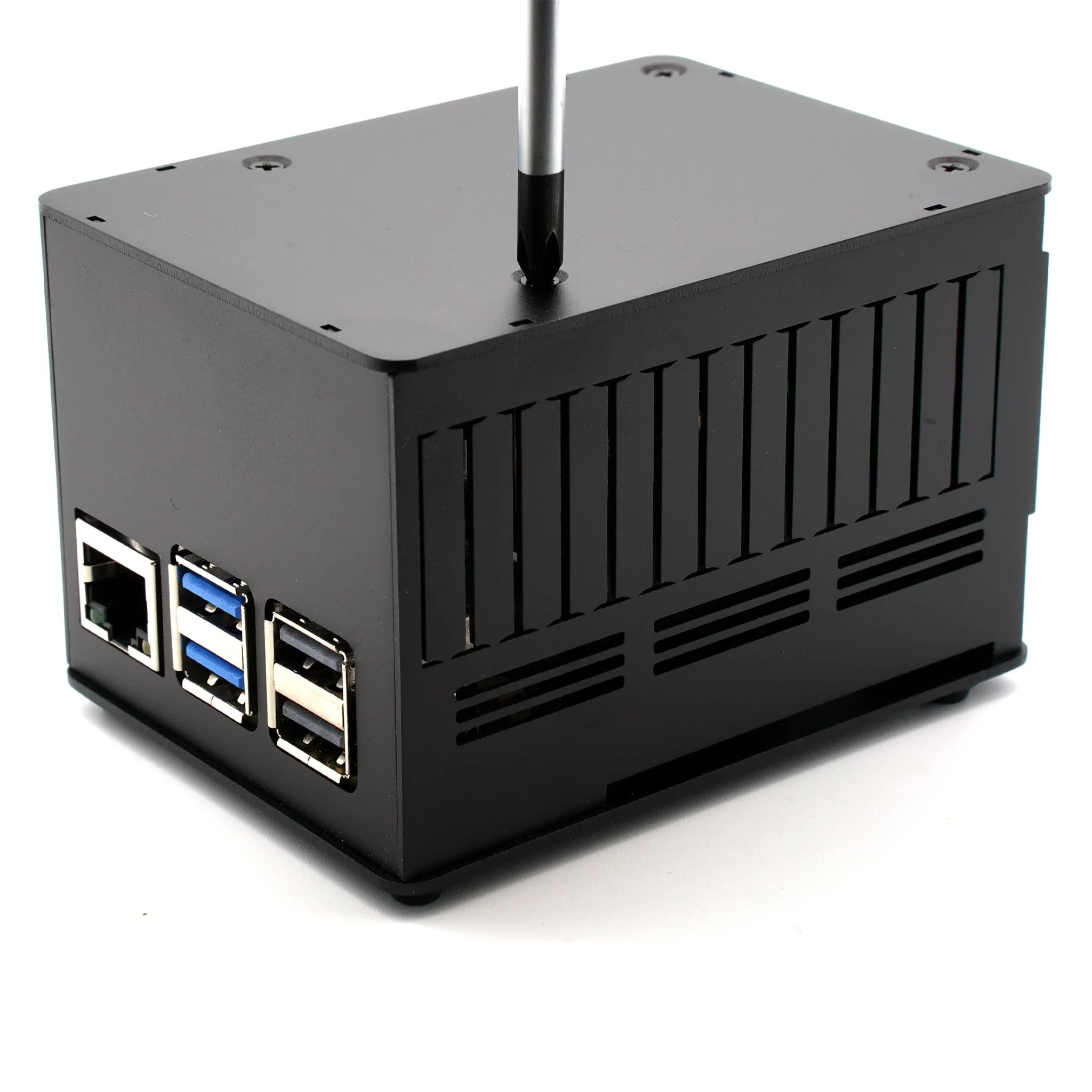 A durable aluminium enclosure for Raspberry Pi 5, supporting standard HATs and NVMe expansion boards.