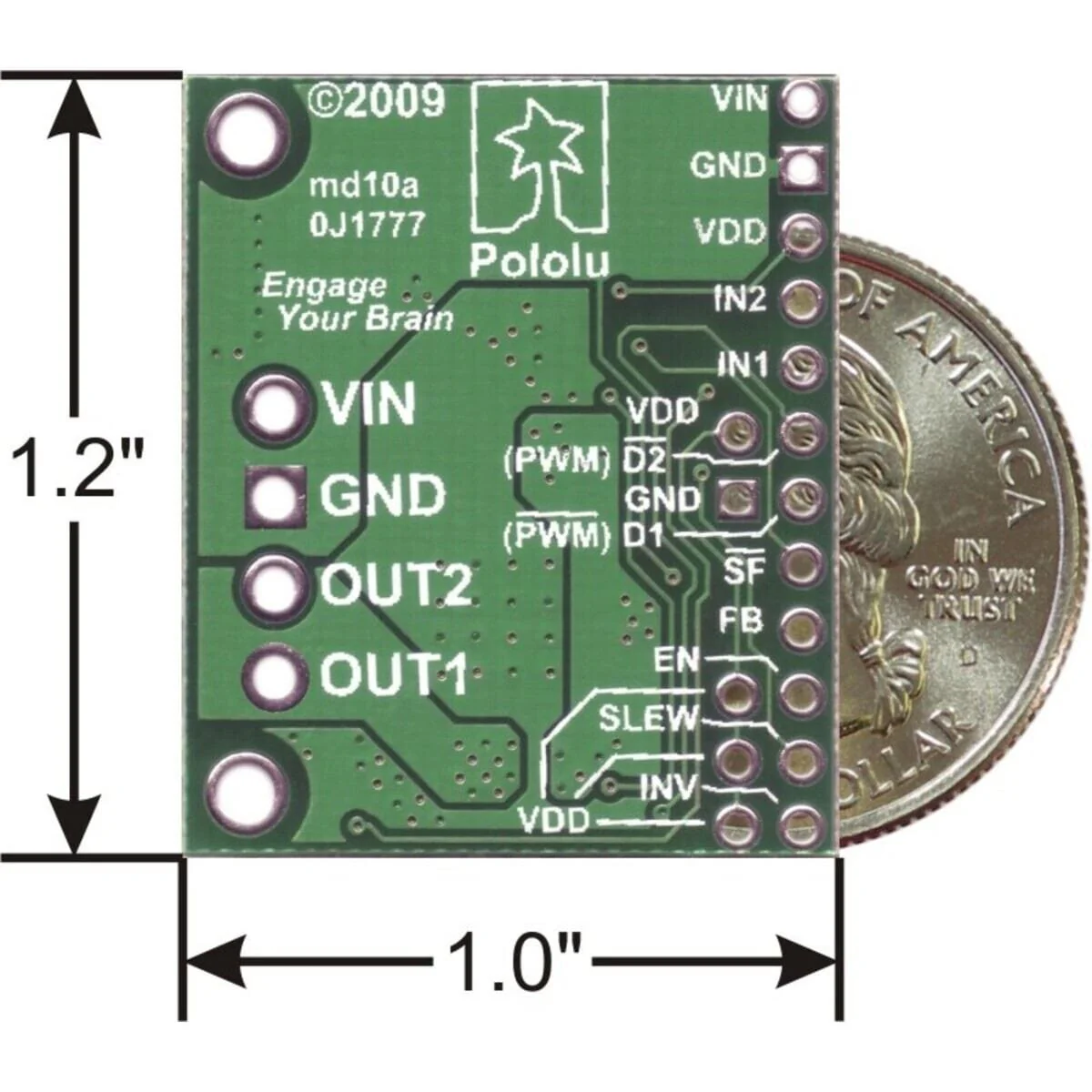 The default states of many of the MC33926 logic input pins requires that many external connections be made to use this motor driver. To reduce the number of necessary external connections, the board has five default-overriding jumpers. All of the default-overriding jumpers are tied to VDD, except the D1 jumper, which is tied to GND. All VDD jumper pads are circles; the ground jumper pad is square.