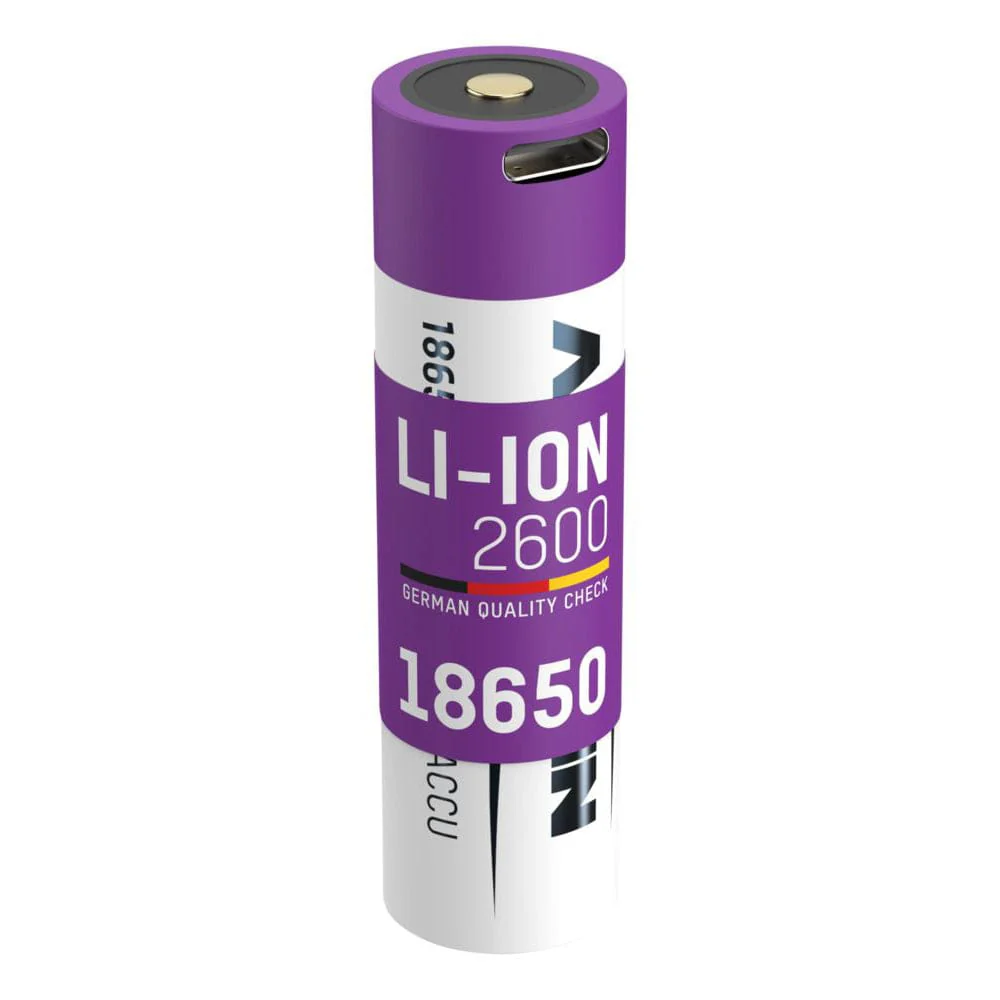 - High-quality ANSMANN Lithium battery 18650 with safety board and integrated USB-C charging socket. The charging current is limited internally to max. 1A.