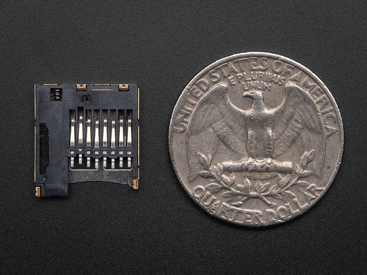 Add tons of storage to your next project with this micro SD card socket. We use this part in all our designs and it works great with any microSD ('transflash') of any storage size. It's a surface-mount part and the pins are underneath so it needs a fine tip and paste or thin solder to get in there and solder, not for beginners! It is a push-push type: push the card in to insert, push again to spring it out.