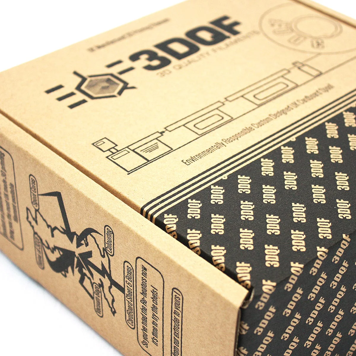 The custom laser-cut cardboard is fully recyclable and includes a filament indicator to help you keep an eye on your remaining filament. 3DQF filament holds a tight tolerance of 0.03mm - and that's over a 52-kilometre run (a human hair is .04!)!