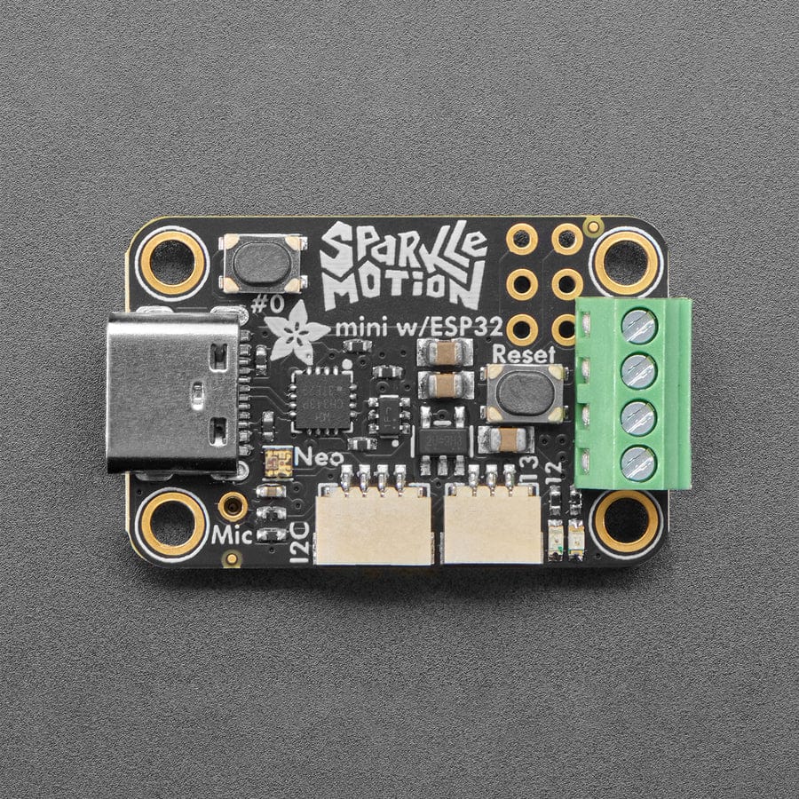 The Adafruit Sparkle Motion Mini is a compact ESP32-based WLED driver board with USB-C power input up to 5V 4A, dual 5V level-shifted outputs, built-in microphone, Stemma QT I2C port, GPIO breakout pads, and integrated NeoPixel.