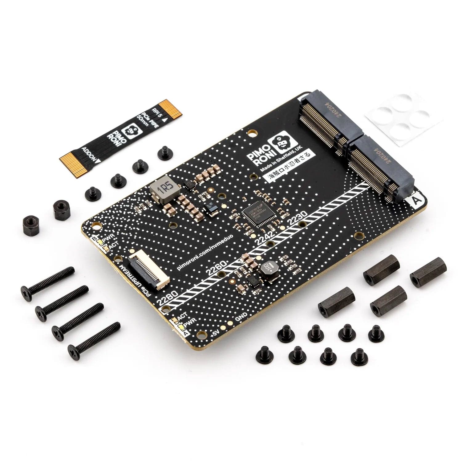 NVMe Base Duo is a PCIe Gen 2 extension board for Raspberry Pi 5. Simply populate it with one or two M-key NVMe SSDs (2230 to 2280 sizes supported) and mount it under (or over) your Pi for a compact and fast storage solution - It even comes with rubber feet!