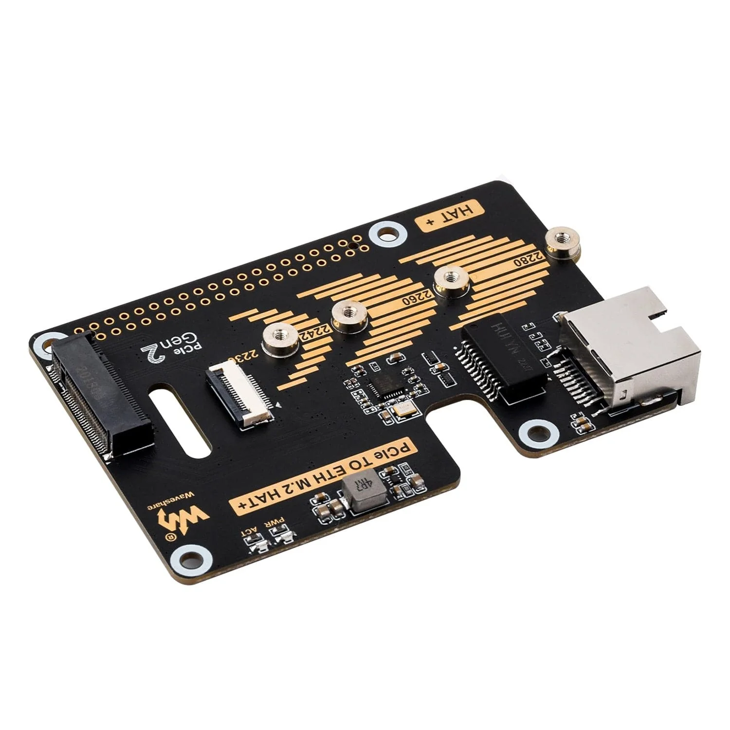 This add-on board connects to your Raspberry Pi 5's PCIe interface and provides an M.2 slot for 2280 / 2260 / 2242 / 2230 NVMe SSDs (such as the Raspberry Pi SSD) and other M.2 devices, alongside a Gigabit Ethernet port/network card to use as a secondary network interface.