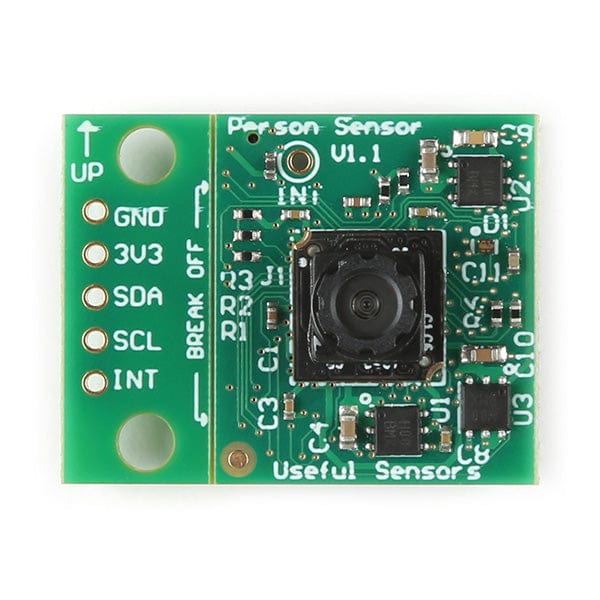 Add advanced computer vision capabilities to your project, without the coding! The Person Sensor from Useful Sensors Inc. includes a camera module pre-programmed with algorithms that detect nearby faces, and return information over a simple Qwiic I2C interface. It is designed to be used as an input to a larger system and be treated like any other sensor where power and information are provided through SparkFun's Qwiic I2C interface. Thereâs also a separate interrupt pin, TP1, which is used to indicate if any people have been detected.