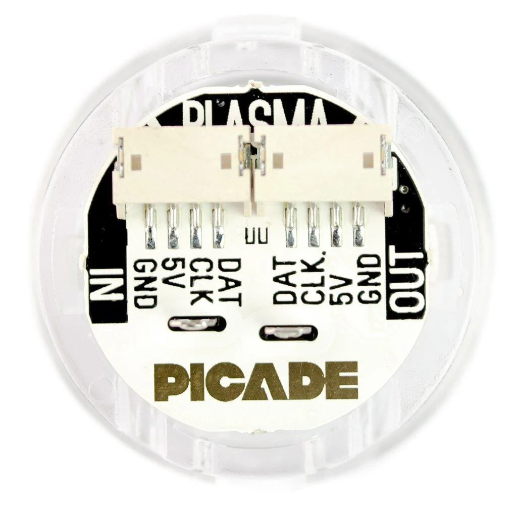 Each Picade Plasma PCB has four tiny, addressable, RGB LEDs (APA102) and a data in and data out JST connector. They're designed to fit neatly inside the recess on the back of our low-profile arcade buttons and shine their light through the clear plastic. The white PCB bounces an spilled light from the LEDs to give them extra GLOW.