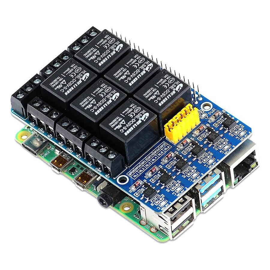 The PiRelay 6 is a relay HAT for the Raspberry Pi that can control up to 6 devices with photo-coupling isolation on a load of 250V AC/7 A, 30V DC/10 A, and a trigger voltage of 3.3V. It comprises an Optocoupler that allows the circuit to transmit an electrical signal between two isolated circuits through light energy.