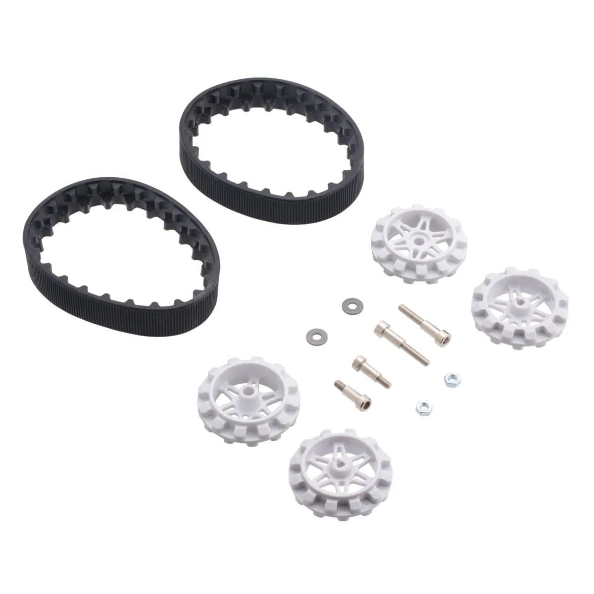This track set includes a pair of silicone tracks, two white drive sprockets measuring 35mm (1.4″) in diameter, and two matching idler sprockets along with mounting hardware.