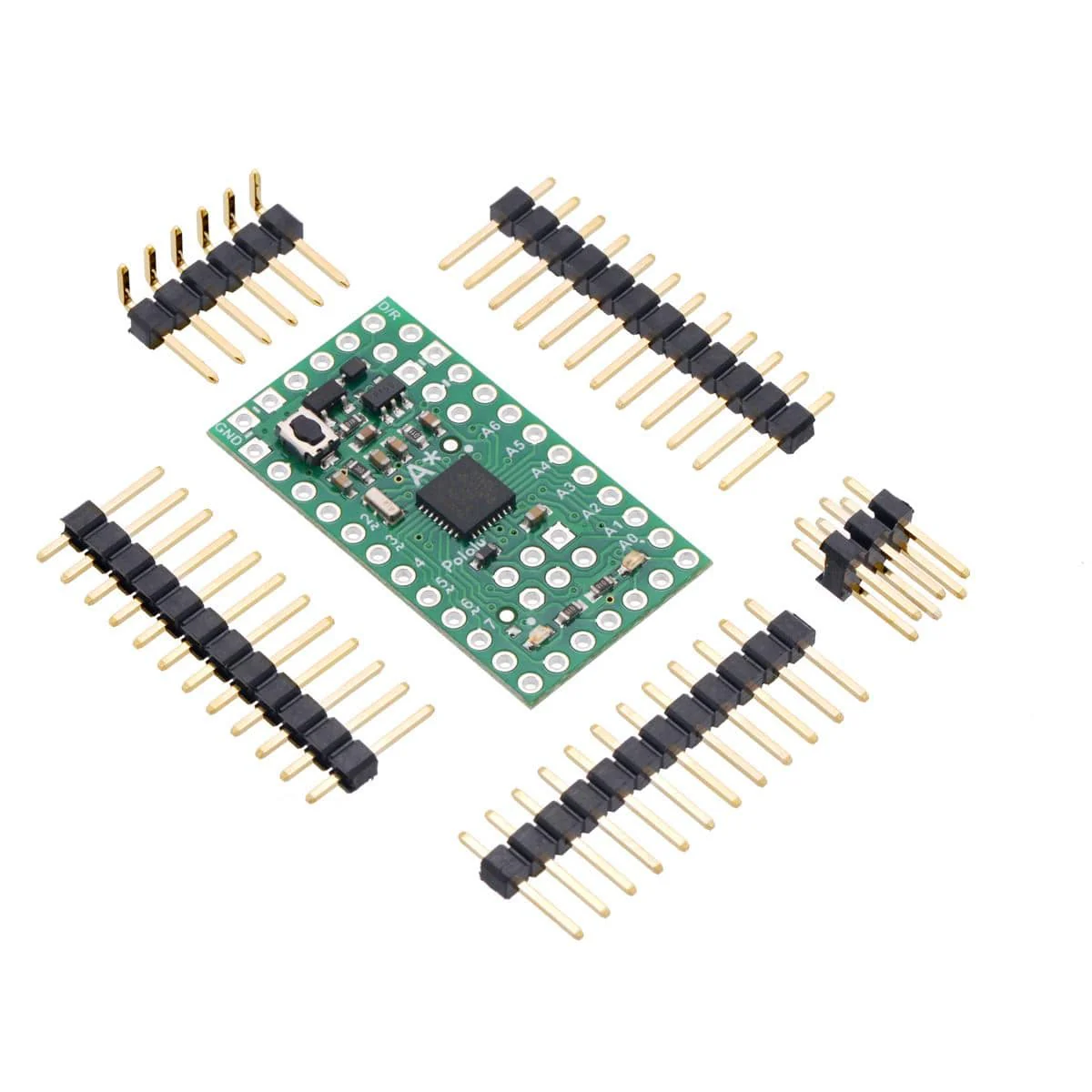 A set of three 1×12-pin breakaway 0.1″ male headers is included with the A-Star 328PB Micro, which can be soldered in to use the board with perfboards, breadboards, or 0.1″ female connectors.