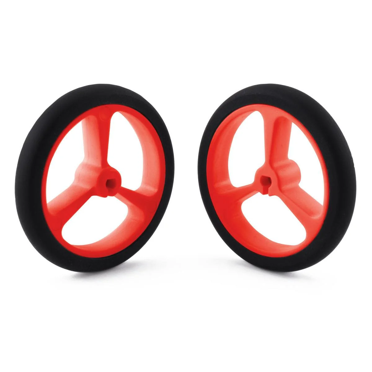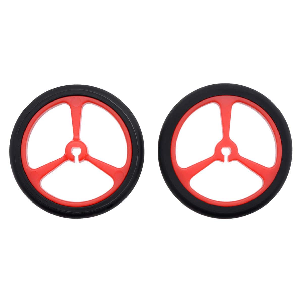 These Pololu red plastic wheels have silicone tires and measure 40mm in diameter, and they press-fit onto the 3mm D shafts on many of our motors, including our micro metal gearmotors and our mini plastic gearmotors. This product is a pair of wheels.