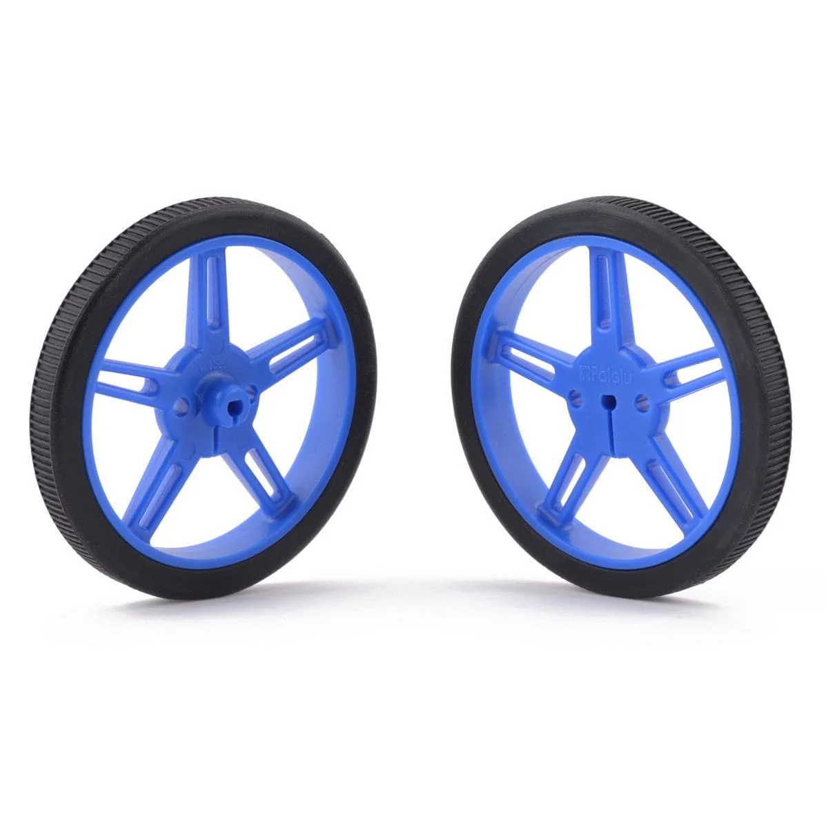 These Pololu blue plastic wheels have silicone tires and measure 60 mm in diameter, and they press-fit onto the 3mm D shafts on many of our motors, including our micro metal gearmotors and mini plastic gearmotors. Additionally, this wheel is compatible with several of our universal mounting hubs, which can serve as adapters for motors with different shafts. This product is a pair of wheels.