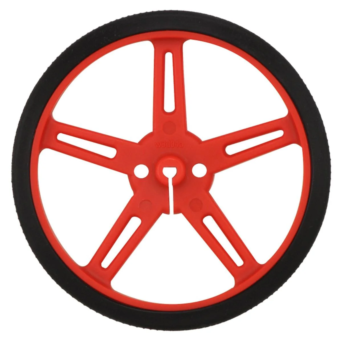 These Pololu red plastic wheels have silicone tires and measure 70mm in diameter, and they press-fit onto the 3mm D shafts on many of our motors, including our micro metal gearmotors and our mini plastic gearmotors. Additionally, this wheel is compatible with several of our universal mounting hubs, which can serve as adapters for motors with different shafts. This product is a pair of wheels.