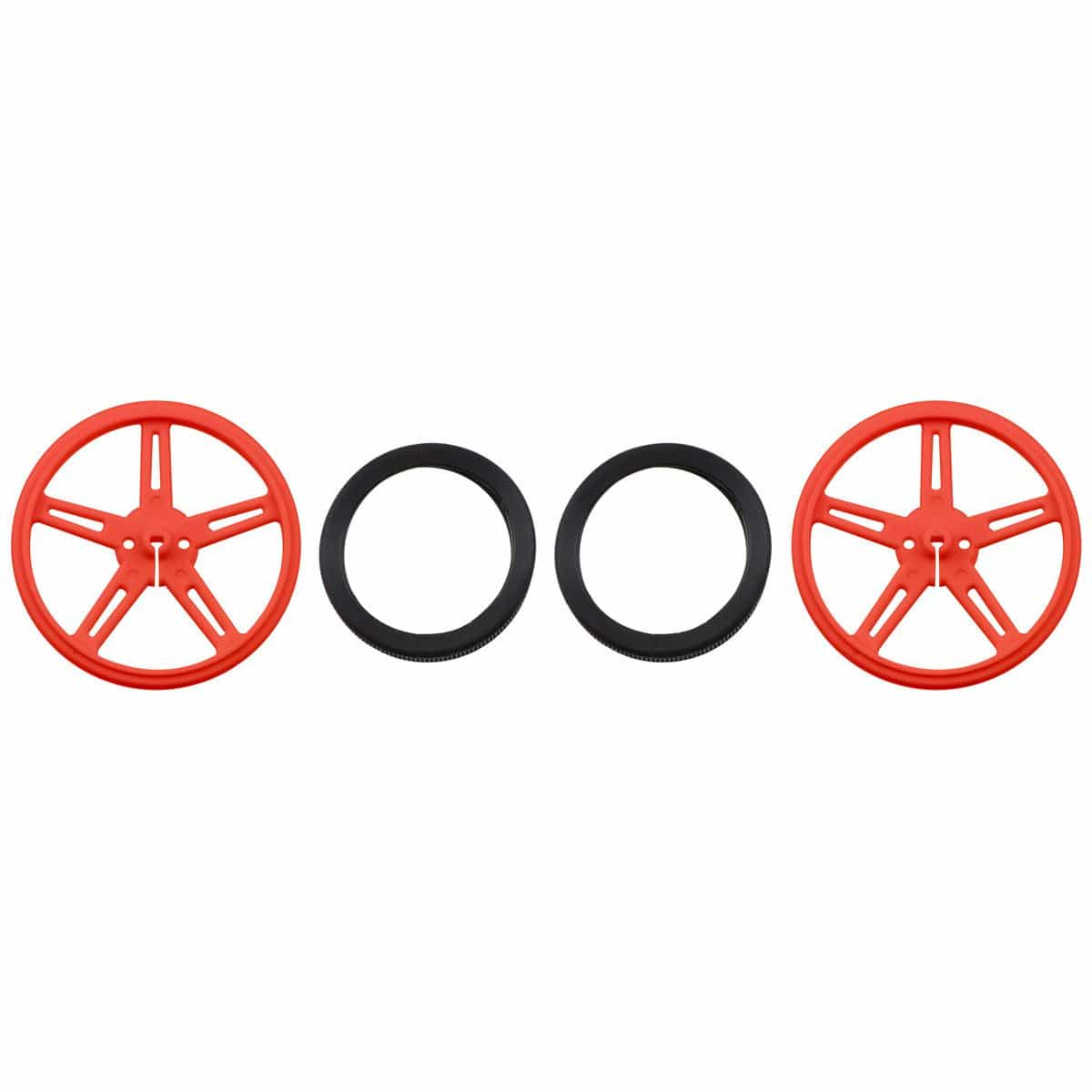 This is the red version of our 70Ă8mm wheel pair. These same-sized wheels are also available in black, yellow, blue, or white. Motors and hubs not included.