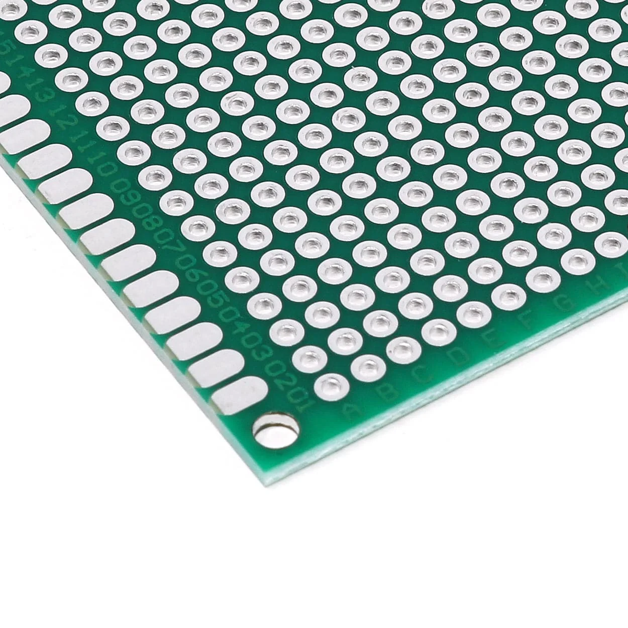 The PCBs are 1.6mm thick, green in colour, and feature corner M2.5 mounting holes and side row/column labelling to help you find your way. The pads are not connected together.
