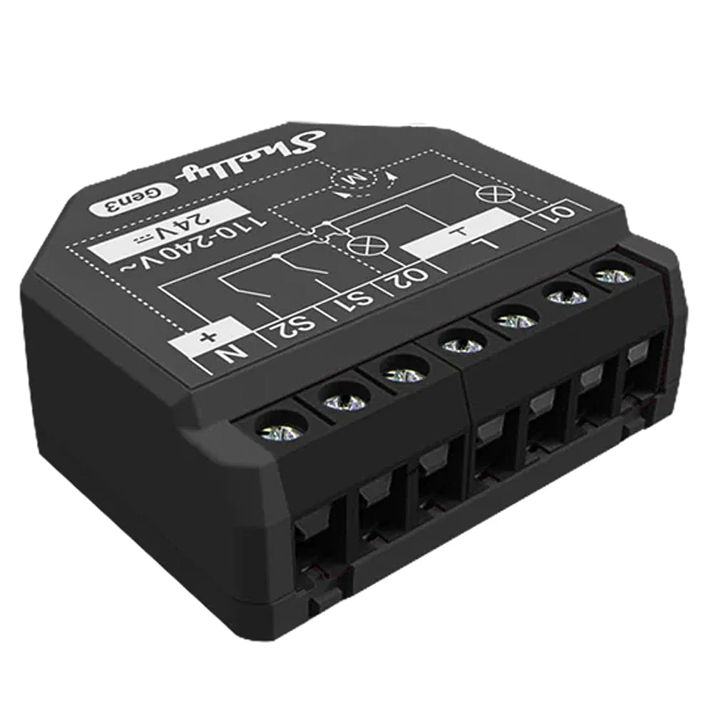 The Shelly 2PM Gen3 is a small form factor Wi-Fi-operated 2-channel smart switch (10A per channel/16A total) with precise power measurement which allows remote control of two devices or cover (roller) control, automating and adjusting the position of roller shutters, blinds, curtains, awnings, bi-directional AC motors. - all through a mobile phone, tablet, PC, or home automation system - and monitor their power usage!