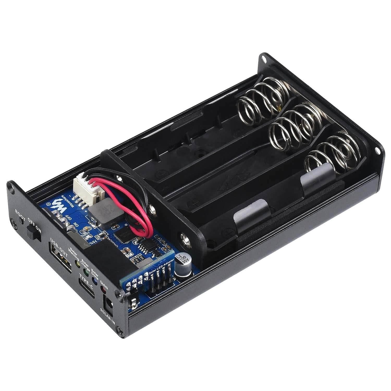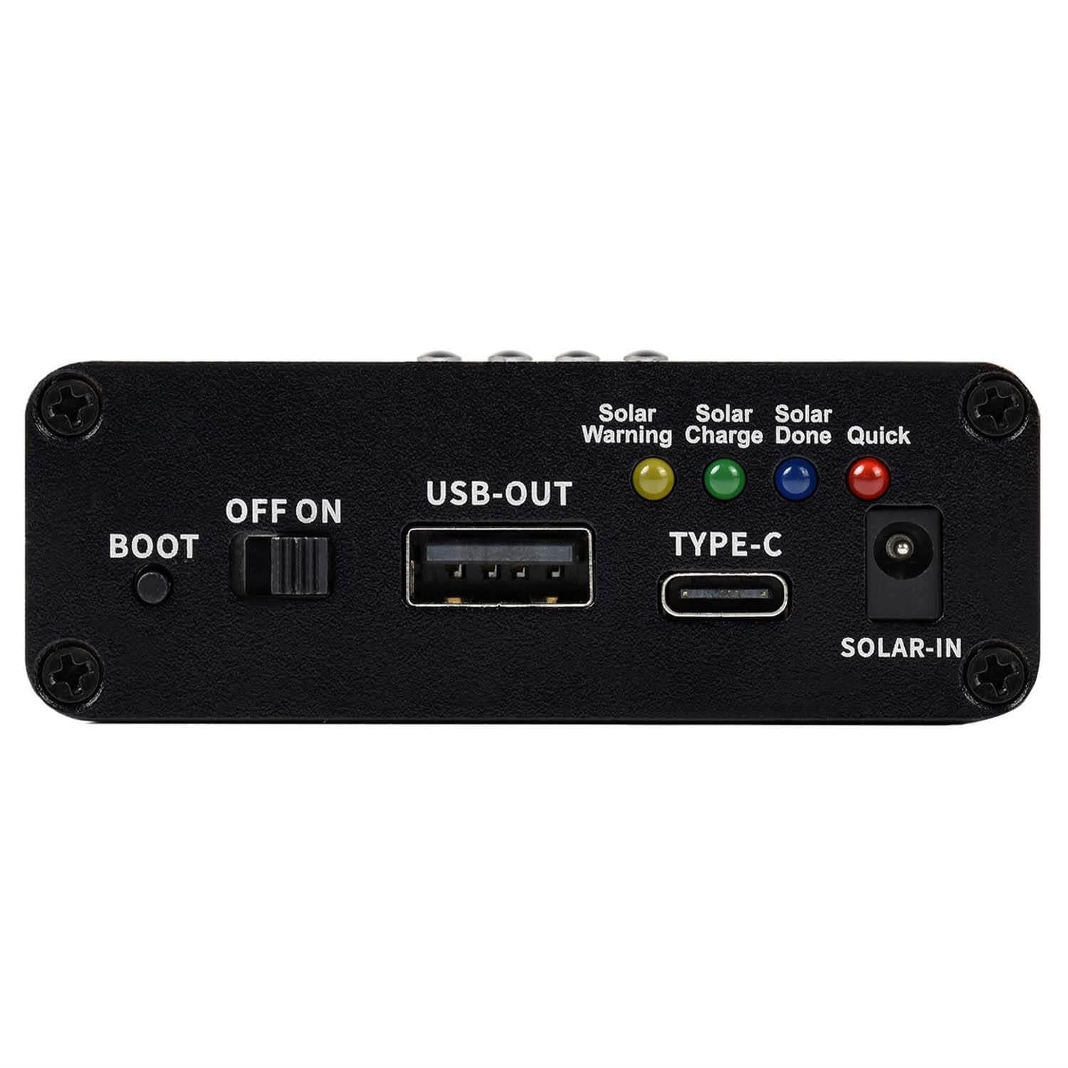 The unit accepts 3x 18650 batteries (batteries not included) which can be recharged from either your connected solar panel or a type-C power adapter (5V, with PD quick charge support).