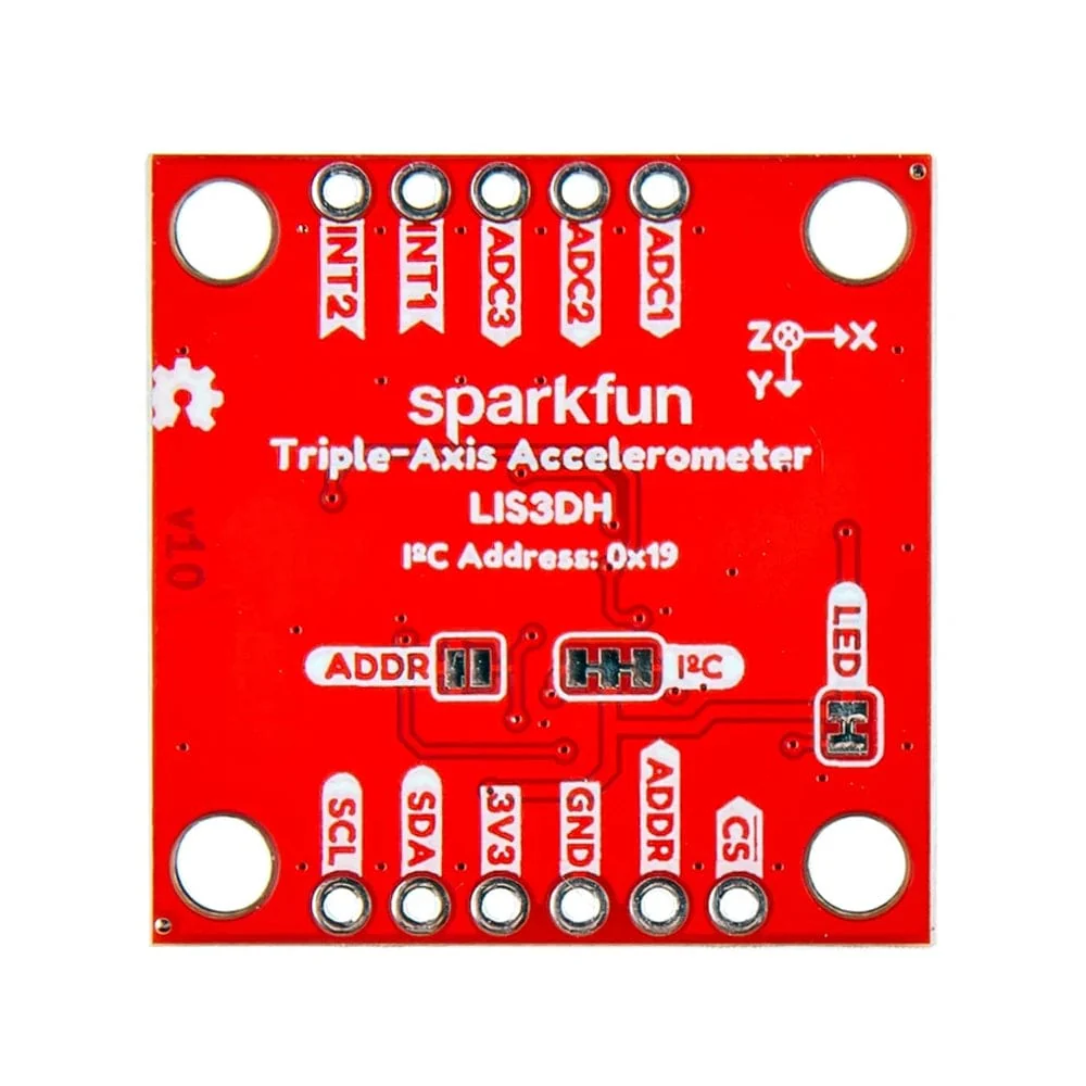 This SparkFun Triple Axis Accelerometer Breakout is a Qwiic-enabled breakout featuring the LIS3DH, a smart, low-power, three-axis, capacitive micro-machined accelerometer with 12-bit resolution, which you can use to add translation detection to your project. This board is classified as a 3DoF or 3 Degrees of Freedom. Inertial Measurement Units (IMUs) can provide additional space location data, such as gyroscopic or magnetometric data. The LIS3DH on this breakout operates under the same principles but offers a few analog inputs for experimentation, and it includes built-in movement detection capabilities. This updated version of the LIS3DH breakout features a standard 1in. by 1in. Qwiic breakout with a pair of Qwiic connectors, allowing for easy integration into the Qwiic ecosystem.