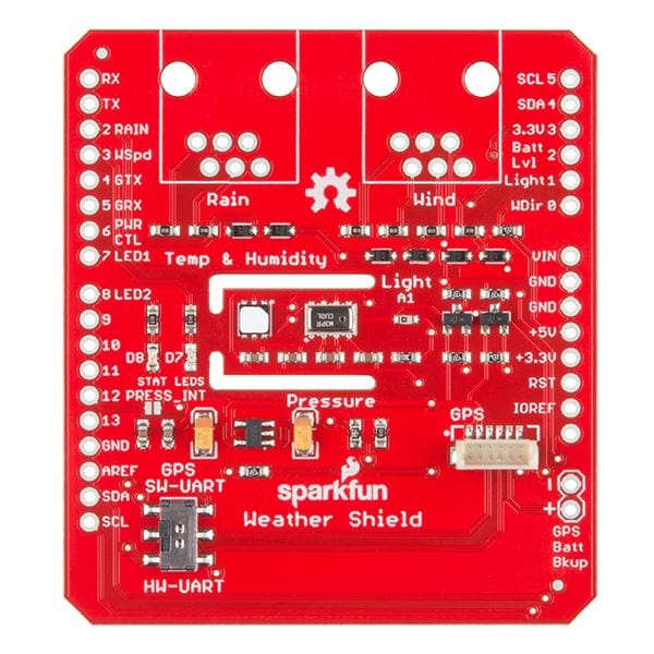 The SparkFun Weather Shield is an easy-to-use Arduino shield that grants you access to barometric pressure, relative humidity, luminosity and temperature. There are also connections on this shield to optional sensors such as wind speed, direction, rain gauge and GPS for location and super accurate timing.