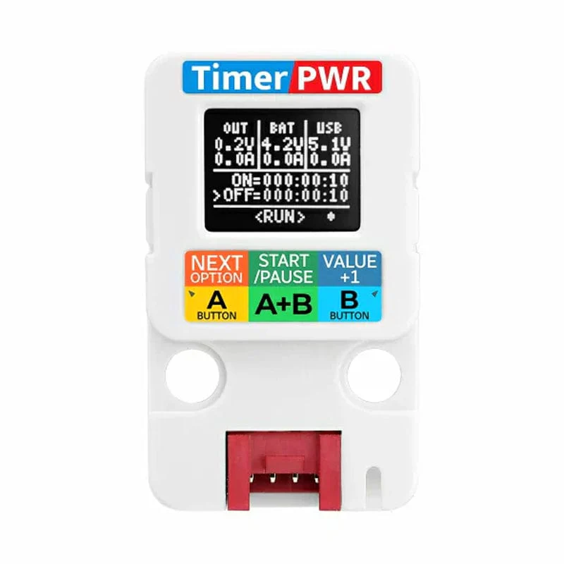 This Timer Power Unit is a smart power supply device that charges and discharges, has timed switching and boosts output. Power is provided through a Type-C connector and can also connect to an external rechargeable battery through a 1.25-2P interface. With an internal STM32 microcontroller handling RTC and overall control, you can set automatic power on and off times.