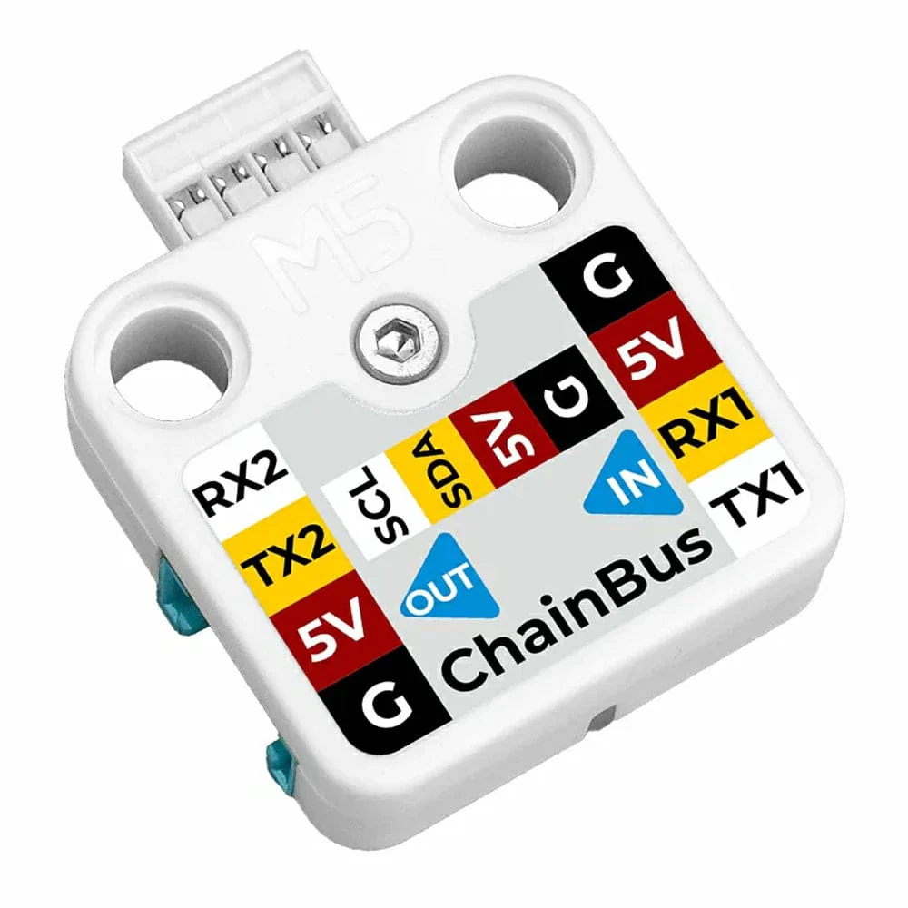 The M5Stack Unit ChainBus is a communication protocol conversion unit for the M5Stack Chain series, designed to simplify connecting and managing multiple devices on a single bus. It integrates an STM32G031G8U6 controller and uses a UART daisy-chain communication protocol, allowing multiple Chain devices to be linked together in a chained setup. It also supports multiple protocol interface conversions, making it possible to expand different peripherals on the same bus while enabling both hardware control and data interaction.